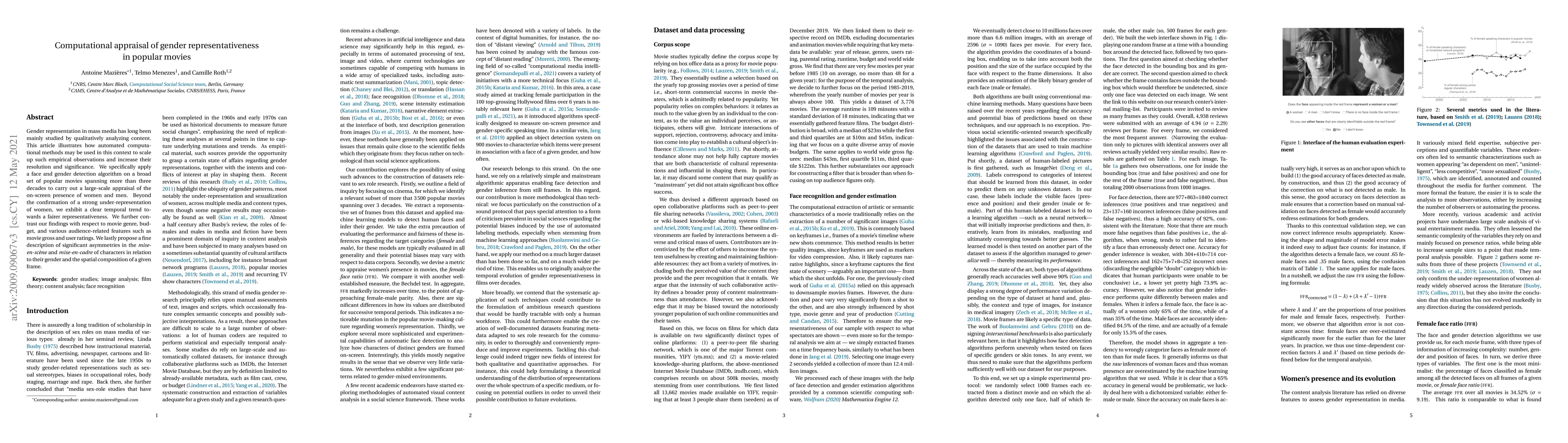 Gender representation in mass media has long been mainly studied by qualitatively analyzing content. This article illustrates how automated computational methods may be used in this context to scale up such empirical observations and increase their resolution and significance. We specifically apply a face and gender detection algorithm on a broad set of popular movies spanning more than three decades to carry out a large-scale appraisal of the on-screen presence of women and men. Beyond the confirmation of a strong under-representation of women, we exhibit a clear temporal trend towards a fairer representativeness. We further contrast our findings with respect to movie genre, budget, and various audience-related features such as movie gross and user ratings. We lastly propose a fine description of significant asymmetries in the mise-en-sc\`ene and mise-en-cadre of characters in relation to their gender and the spatial composition of a given frame.