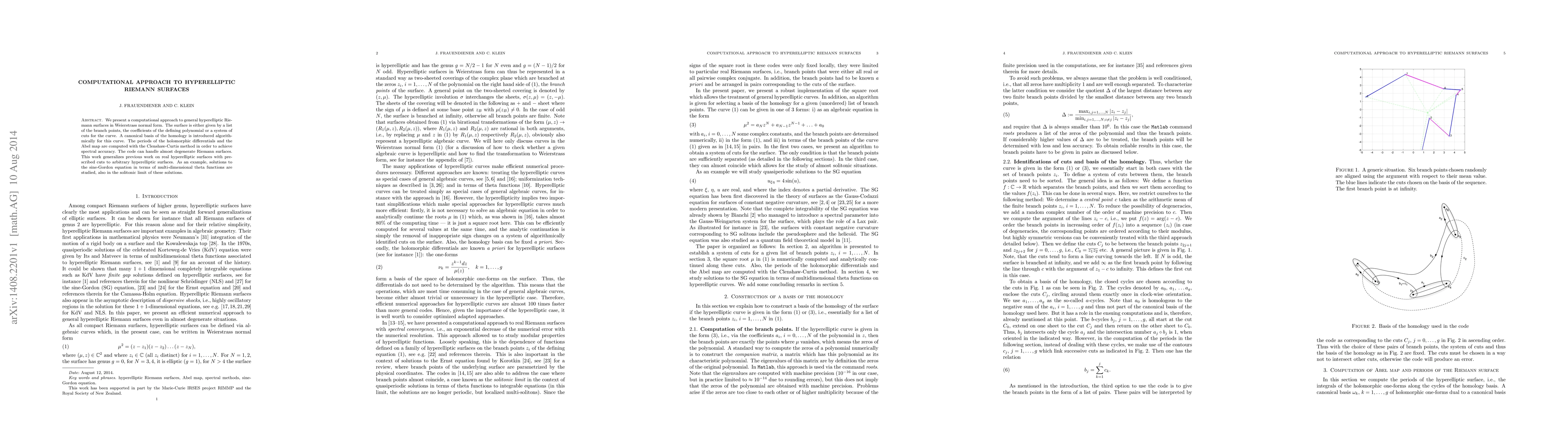 We present a computational approach to general hyperelliptic Riemann surfaces in Weierstrass normal form. The surface is either given by a list of the branch points, the coefficients of the defining polynomial or a system of cuts for the curve. A canonical basis of the homology is introduced algorithmically for this curve. The periods of the holomorphic differentials and the Abel map are computed with the Clenshaw-Curtis method in order to achieve spectral accuracy. The code can handle almost degenerate Riemann surfaces. This work generalizes previous work on real hyperelliptic surfaces with prescribed cuts to arbitrary hyperelliptic surfaces. As an example, solutions to the sine-Gordon equation in terms of multi-dimensional theta functions are studied, also in the solitonic limit of these solutions.