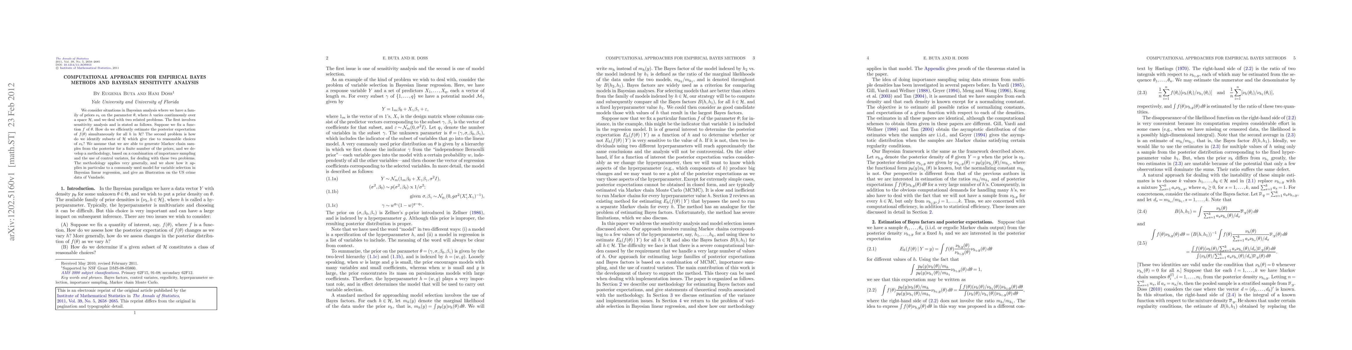 We consider situations in Bayesian analysis where we have a family of priors $\nu_h$ on the parameter $\theta$, where $h$ varies continuously over a space $\mathcal{H}$, and we deal with two related problems. The first involves sensitivity analysis and is stated as follows. Suppose we fix a function $f$ of $\theta$. How do we efficiently estimate the posterior expectation of $f(\theta)$ simultaneously for all $h$ in $\mathcal{H}$? The second problem is how do we identify subsets of $\mathcal{H}$ which give rise to reasonable choices of $\nu_h$? We assume that we are able to generate Markov chain samples from the posterior for a finite number of the priors, and we develop a methodology, based on a combination of importance sampling and the use of control variates, for dealing with these two problems. The methodology applies very generally, and we show how it applies in particular to a commonly used model for variable selection in Bayesian linear regression, and give an illustration on the US crime data of Vandaele.