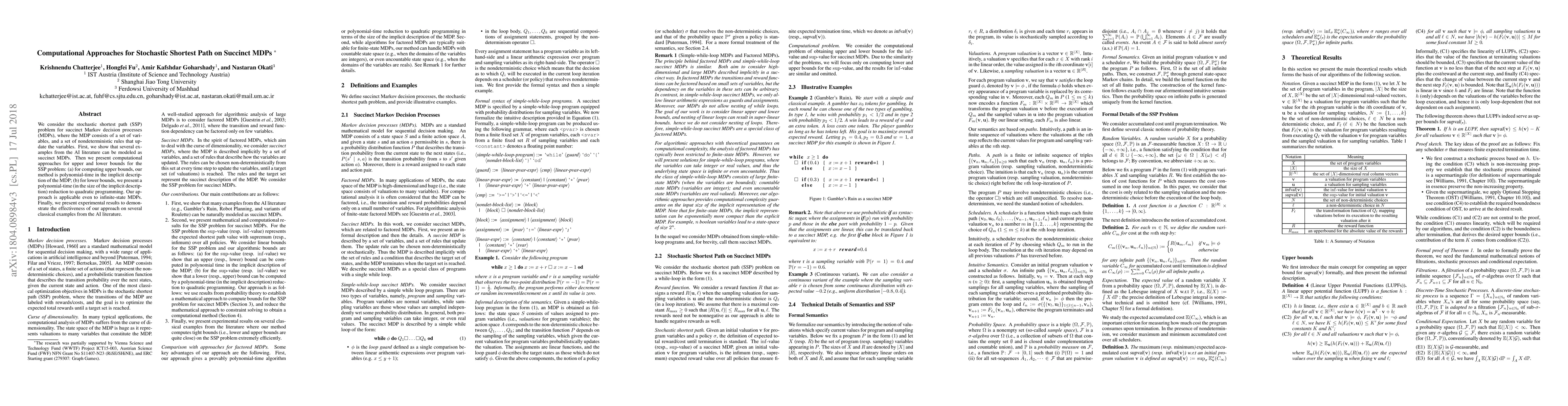 We consider the stochastic shortest path (SSP) problem for succinct Markov decision processes (MDPs), where the MDP consists of a set of variables, and a set of nondeterministic rules that update the variables. First, we show that several examples from the AI literature can be modeled as succinct MDPs. Then we present computational approaches for upper and lower bounds for the SSP problem: (a)~for computing upper bounds, our method is polynomial-time in the implicit description of the MDP; (b)~for lower bounds, we present a polynomial-time (in the size of the implicit description) reduction to quadratic programming. Our approach is applicable even to infinite-state MDPs. Finally, we present experimental results to demonstrate the effectiveness of our approach on several classical examples from the AI literature.