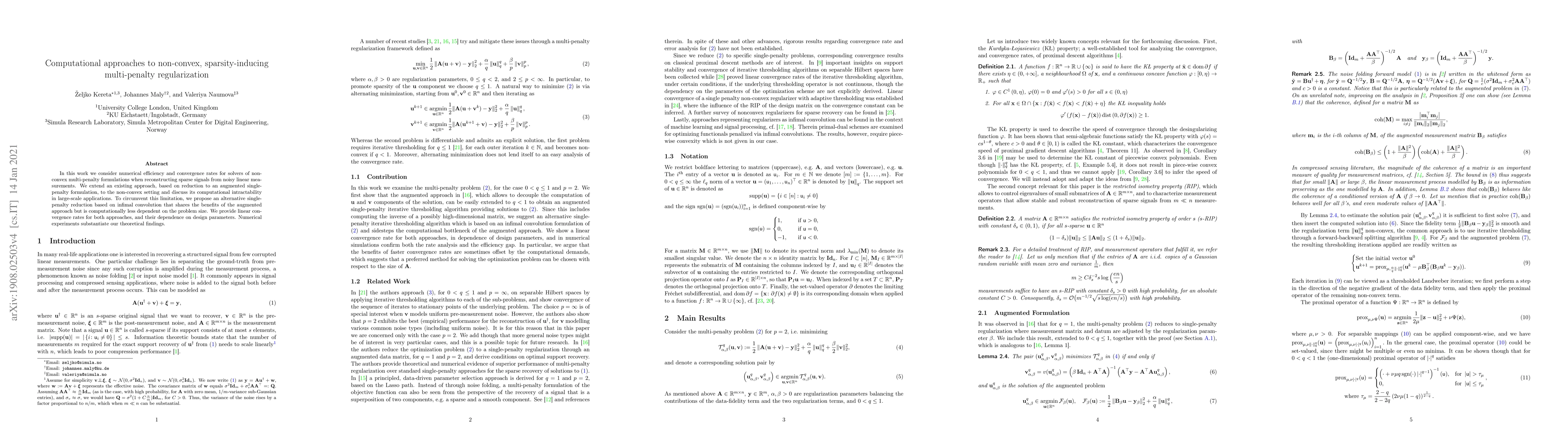 This paper investigates computational methods for solving non-convex, sparsity-inducing multi-penalty regularization problems in signal reconstruction. It proposes an alternative single-penalty reduction technique based on infimal convolution that maintains efficiency while improving scalability over existing augmented approaches, supported by theoretical convergence rates and numerical experiments.