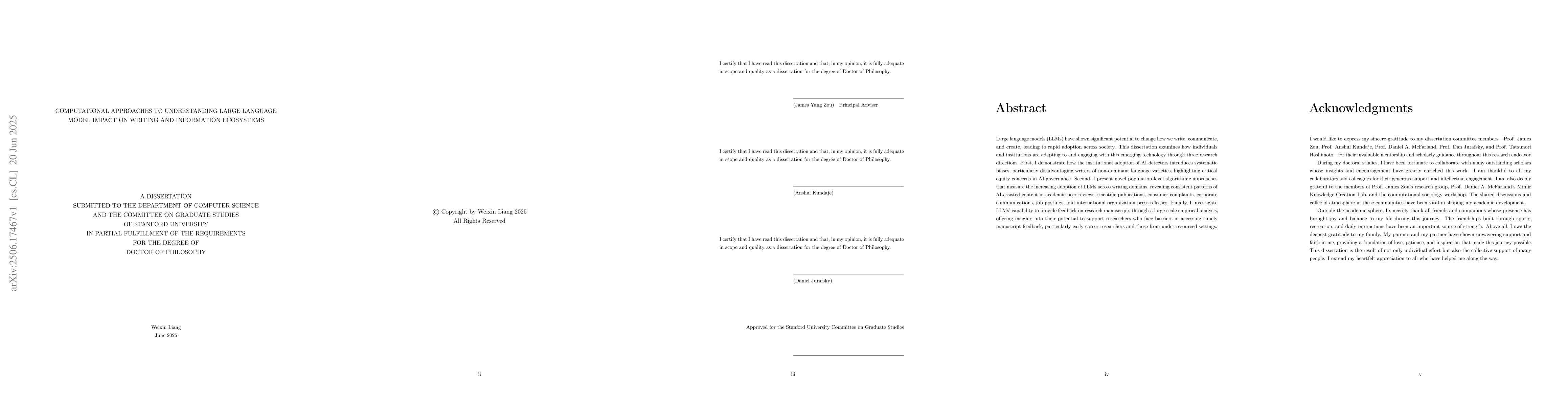 Large language models (LLMs) have shown significant potential to change how we write, communicate, and create, leading to rapid adoption across society. This dissertation examines how individuals and institutions are adapting to and engaging with this emerging technology through three research directions. First, I demonstrate how the institutional adoption of AI detectors introduces systematic biases, particularly disadvantaging writers of non-dominant language varieties, highlighting critical equity concerns in AI governance. Second, I present novel population-level algorithmic approaches that measure the increasing adoption of LLMs across writing domains, revealing consistent patterns of AI-assisted content in academic peer reviews, scientific publications, consumer complaints, corporate communications, job postings, and international organization press releases. Finally, I investigate LLMs' capability to provide feedback on research manuscripts through a large-scale empirical analysis, offering insights into their potential to support researchers who face barriers in accessing timely manuscript feedback, particularly early-career researchers and those from under-resourced settings.