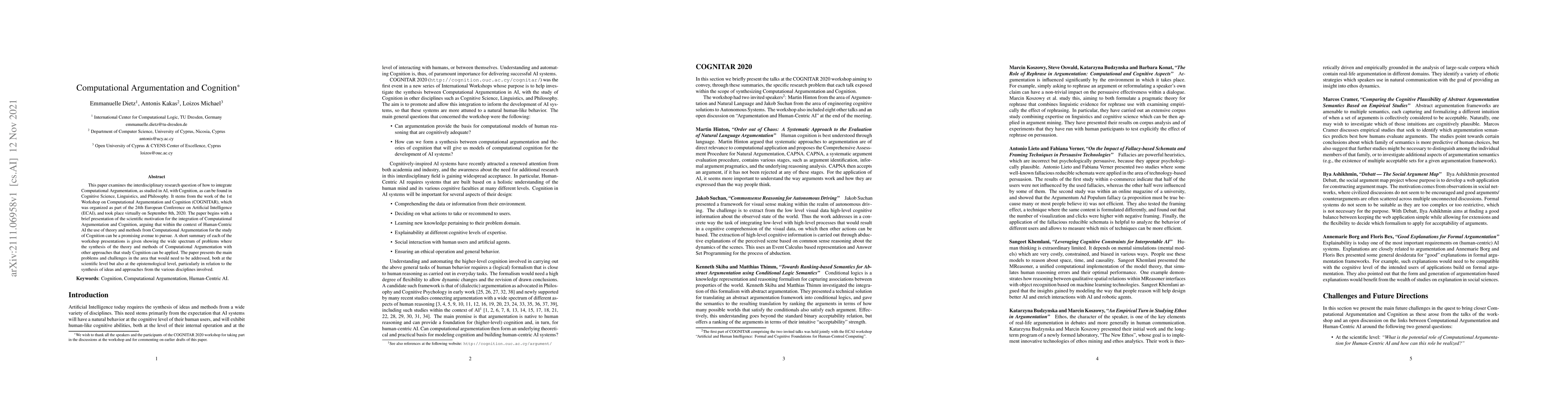 This paper explores integrating Computational Argumentation from AI with Cognition from Cognitive Science, Linguistics, and Philosophy, highlighting its potential for Human-Centric AI. It summarizes workshop presentations demonstrating applications across diverse fields and discusses challenges at scientific and epistemological levels.