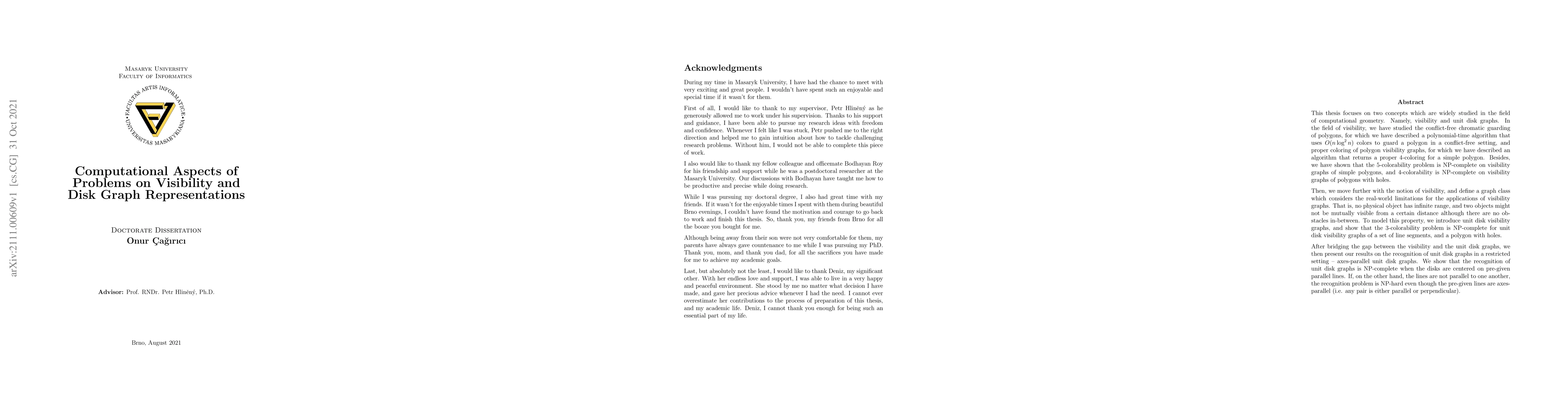 This thesis explores computational aspects of visibility and unit disk graphs in computational geometry, including a polynomial-time algorithm for conflict-free chromatic guarding of polygons and proper 4-coloring of polygon visibility graphs. It also addresses the NP-completeness of colorability problems for visibility graphs and unit disk visibility graphs, and the NP-hardness of recognizing unit disk graphs in specific settings.