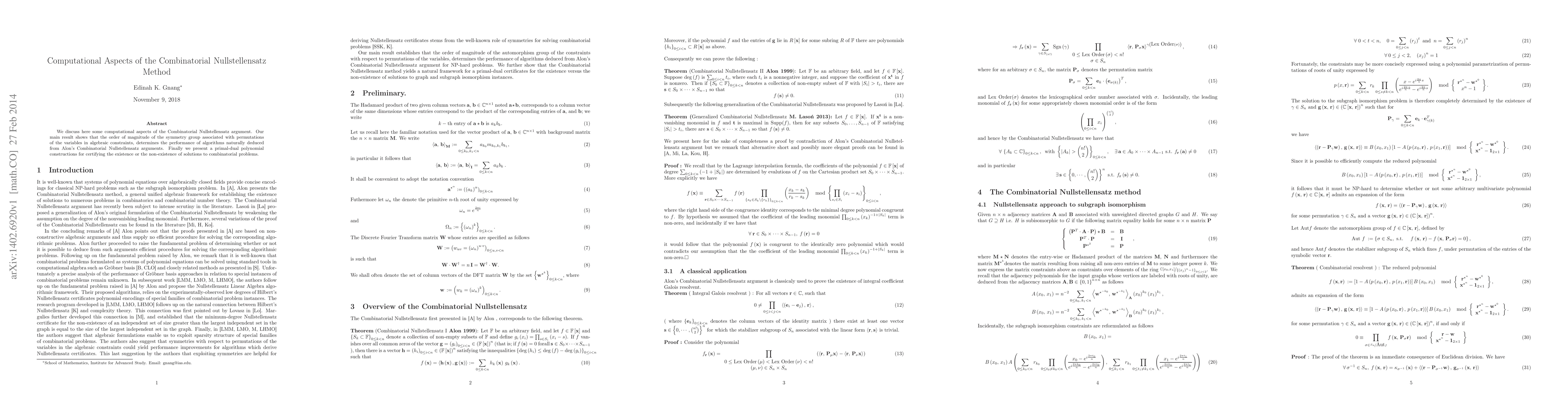 We discuss here some computational aspects of the Combinatorial Nullstellensatz argument. Our main result shows that the order of magnitude of the symmetry group associated with permutations of the variables in algebraic constraints, determines the performance of algorithms naturally deduced from Alon's Combinatorial Nullstellensatz arguments. Finally we present a primal-dual polynomial constructions for certifying the existence or the non-existence of solutions to combinatorial problems.