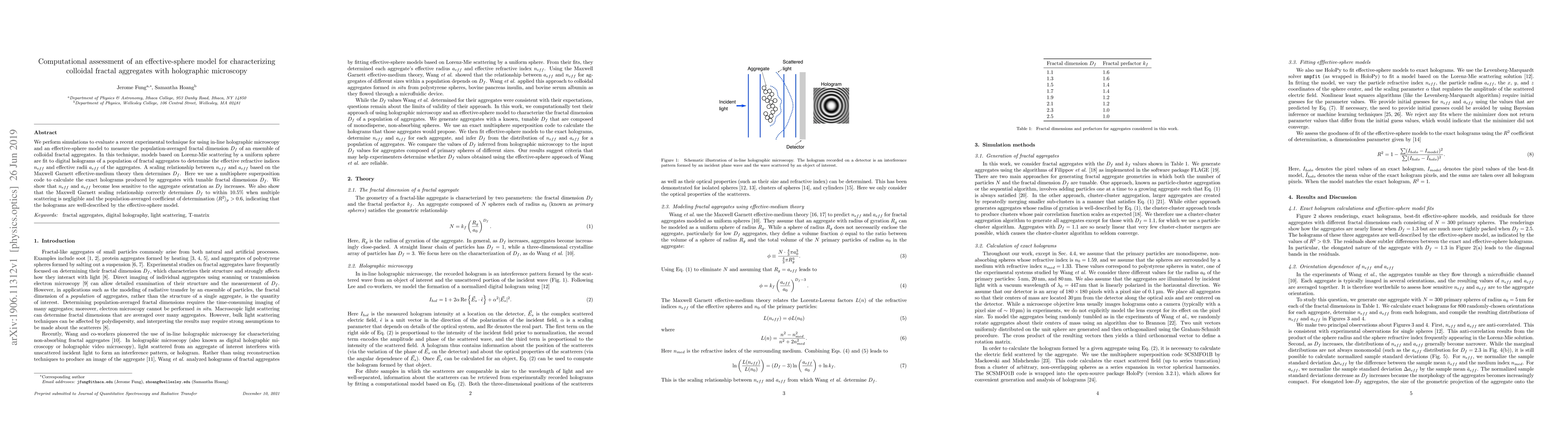 This paper evaluates a technique using in-line holographic microscopy and an effective-sphere model to measure the fractal dimension $D_f$ of colloidal aggregates. The study finds that the technique accurately determines $D_f$ within 10.5% when the population-averaged coefficient of determination is above 0.6.