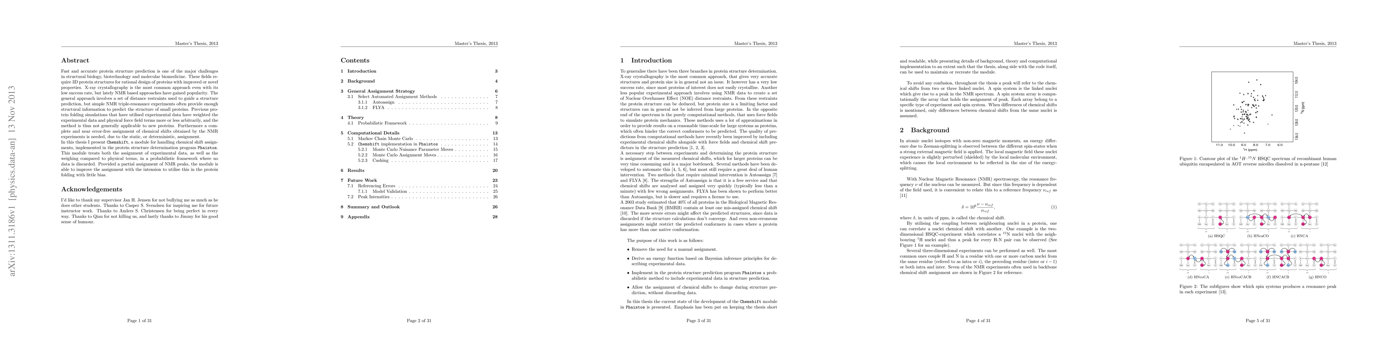 This paper introduces Chemshift, a computational module for assigning chemical shifts in NMR experiments, integrated into the Phaistos protein structure prediction program. It aims to improve the accuracy of protein structure prediction by handling experimental data and physical force fields in a probabilistic framework, ensuring no data is discarded.