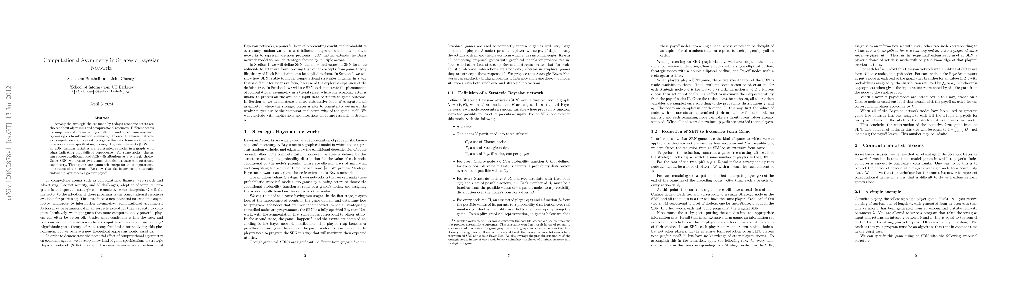 Among the strategic choices made by today's economic actors are choices about algorithms and computational resources. Different access to computational resources may result in a kind of economic asymmetry analogous to information asymmetry. In order to represent strategic computational choices within a game theoretic framework, we propose a new game specification, Strategic Bayesian Networks (SBN). In an SBN, random variables are represented as nodes in a graph, with edges indicating probabilistic dependence. For some nodes, players can choose conditional probability distributions as a strategic choice. Using SBN, we present two games that demonstrate computational asymmetry. These games are symmetric except for the computational limitations of the actors. We show that the better computationally endowed player receives greater payoff.