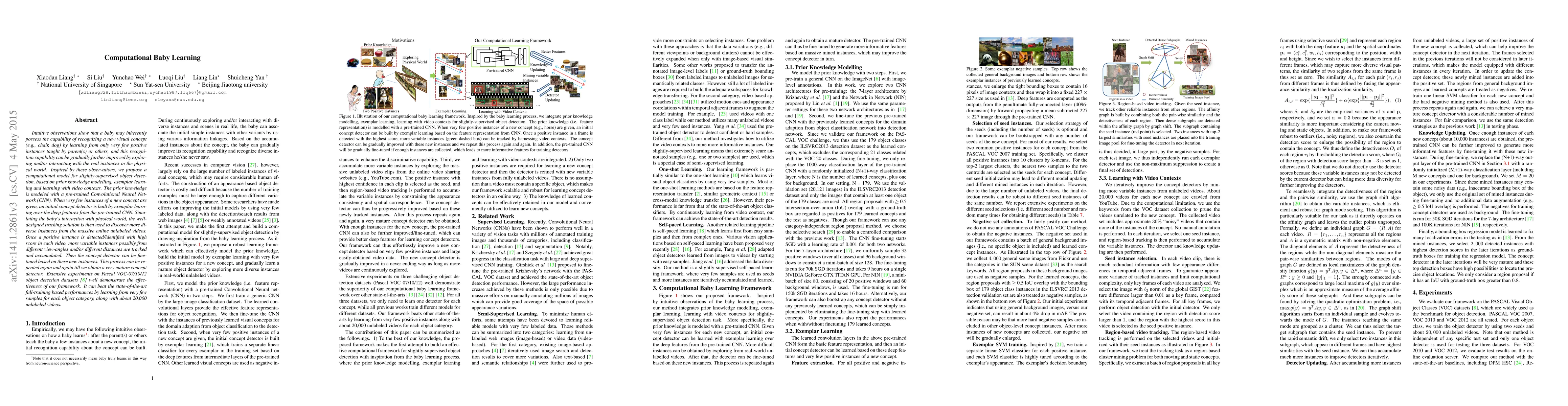 Intuitive observations show that a baby may inherently possess the capability of recognizing a new visual concept (e.g., chair, dog) by learning from only very few positive instances taught by parent(s) or others, and this recognition capability can be gradually further improved by exploring and/or interacting with the real instances in the physical world. Inspired by these observations, we propose a computational model for slightly-supervised object detection, based on prior knowledge modelling, exemplar learning and learning with video contexts. The prior knowledge is modeled with a pre-trained Convolutional Neural Network (CNN). When very few instances of a new concept are given, an initial concept detector is built by exemplar learning over the deep features from the pre-trained CNN. Simulating the baby's interaction with physical world, the well-designed tracking solution is then used to discover more diverse instances from the massive online unlabeled videos. Once a positive instance is detected/identified with high score in each video, more variable instances possibly from different view-angles and/or different distances are tracked and accumulated. Then the concept detector can be fine-tuned based on these new instances. This process can be repeated again and again till we obtain a very mature concept detector. Extensive experiments on Pascal VOC-07/10/12 object detection datasets well demonstrate the effectiveness of our framework. It can beat the state-of-the-art full-training based performances by learning from very few samples for each object category, along with about 20,000 unlabeled videos.
