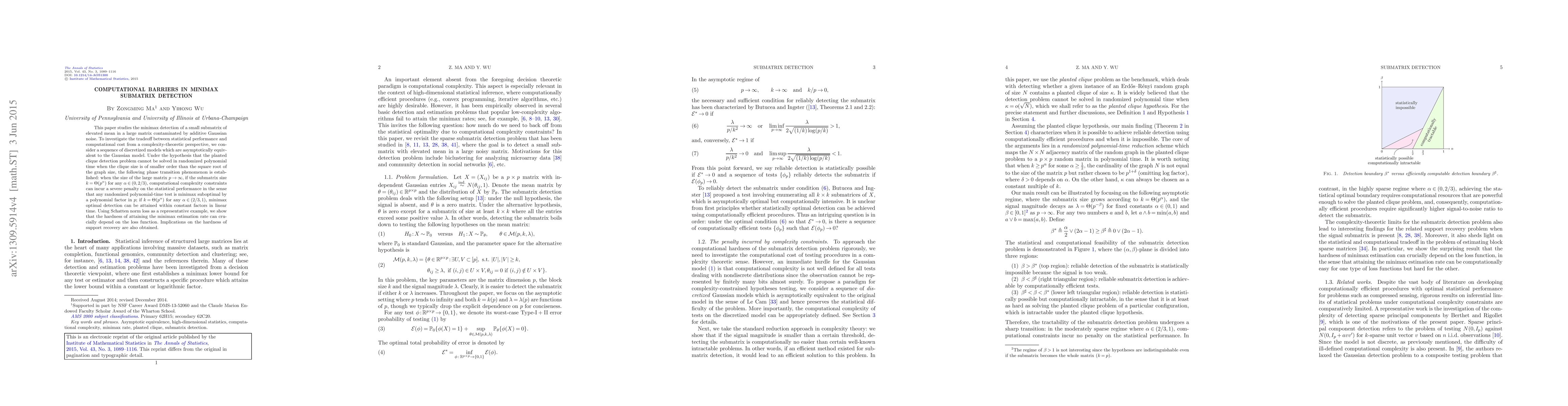 This paper studies the minimax detection of a small submatrix of elevated mean in a large matrix contaminated by additive Gaussian noise. To investigate the tradeoff between statistical performance and computational cost from a complexity-theoretic perspective, we consider a sequence of discretized models which are asymptotically equivalent to the Gaussian model. Under the hypothesis that the planted clique detection problem cannot be solved in randomized polynomial time when the clique size is of smaller order than the square root of the graph size, the following phase transition phenomenon is established: when the size of the large matrix $p\to\infty$, if the submatrix size $k=\Theta(p^{\alpha})$ for any $\alpha\in(0,{2}/{3})$, computational complexity constraints can incur a severe penalty on the statistical performance in the sense that any randomized polynomial-time test is minimax suboptimal by a polynomial factor in $p$; if $k=\Theta(p^{\alpha})$ for any $\alpha\in({2}/{3},1)$, minimax optimal detection can be attained within constant factors in linear time. Using Schatten norm loss as a representative example, we show that the hardness of attaining the minimax estimation rate can crucially depend on the loss function. Implications on the hardness of support recovery are also obtained.