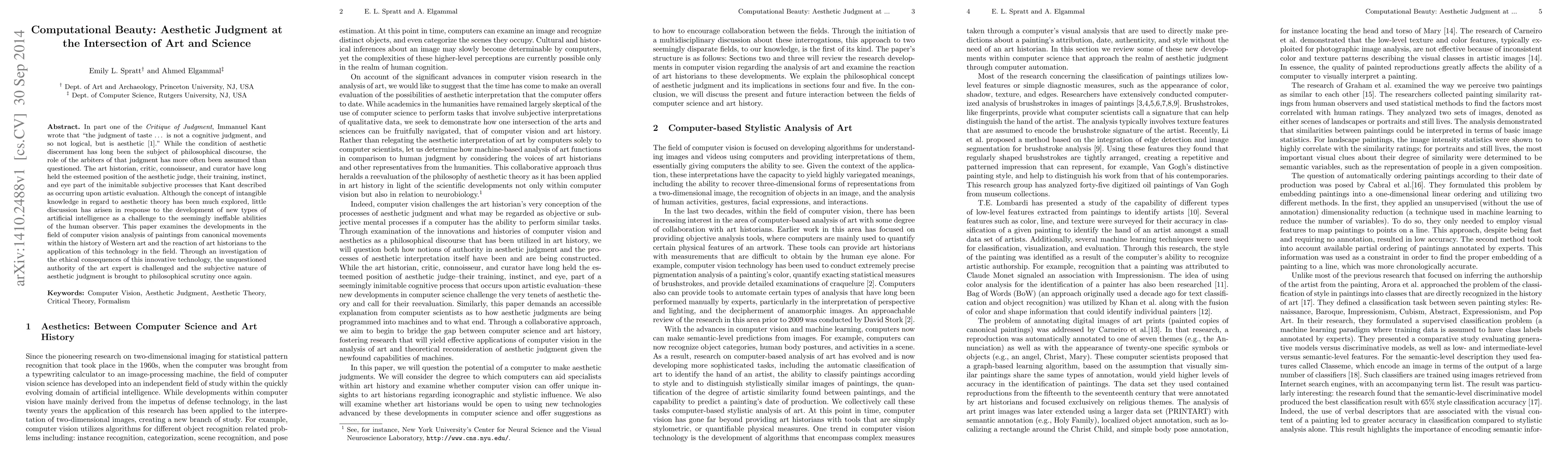 In part one of the Critique of Judgment, Immanuel Kant wrote that "the judgment of taste...is not a cognitive judgment, and so not logical, but is aesthetic."\cite{Kant} While the condition of aesthetic discernment has long been the subject of philosophical discourse, the role of the arbiters of that judgment has more often been assumed than questioned. The art historian, critic, connoisseur, and curator have long held the esteemed position of the aesthetic judge, their training, instinct, and eye part of the inimitable subjective processes that Kant described as occurring upon artistic evaluation. Although the concept of intangible knowledge in regard to aesthetic theory has been much explored, little discussion has arisen in response to the development of new types of artificial intelligence as a challenge to the seemingly ineffable abilities of the human observer. This paper examines the developments in the field of computer vision analysis of paintings from canonical movements with the history of Western art and the reaction of art historians to the application of this technology in the field. Through an investigation of the ethical consequences of this innovative technology, the unquestioned authority of the art expert is challenged and the subjective nature of aesthetic judgment is brought to philosophical scrutiny once again.