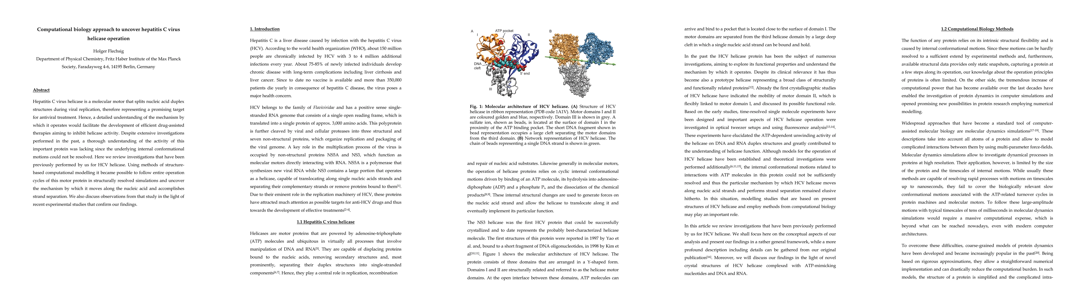 This paper employs computational biology to elucidate the mechanism of hepatitis C virus helicase, a key molecular motor in viral replication, by simulating its operation cycles and uncovering its conformational motions. The findings are corroborated by recent experimental studies, providing a foundation for developing antiviral therapies targeting helicase activity.