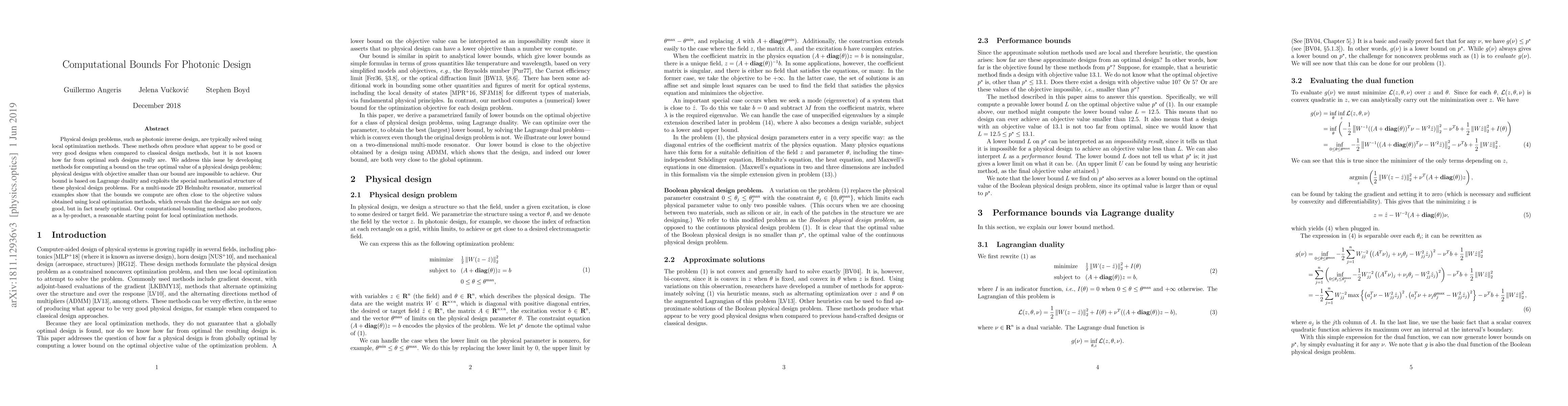 Physical design problems, such as photonic inverse design, are typically solved using local optimization methods. These methods often produce what appear to be good or very good designs when compared to classical design methods, but it is not known how far from optimal such designs really are. We address this issue by developing methods for computing a bound on the true optimal value of a physical design problem; physical designs with objective smaller than our bound are impossible to achieve. Our bound is based on Lagrange duality and exploits the special mathematical structure of these physical design problems. For a multi-mode 2D Helmholtz resonator, numerical examples show that the bounds we compute are often close to the objective values obtained using local optimization methods, which reveals that the designs are not only good, but in fact nearly optimal. Our computational bounding method also produces, as a by-product, a reasonable starting point for local optimization methods.