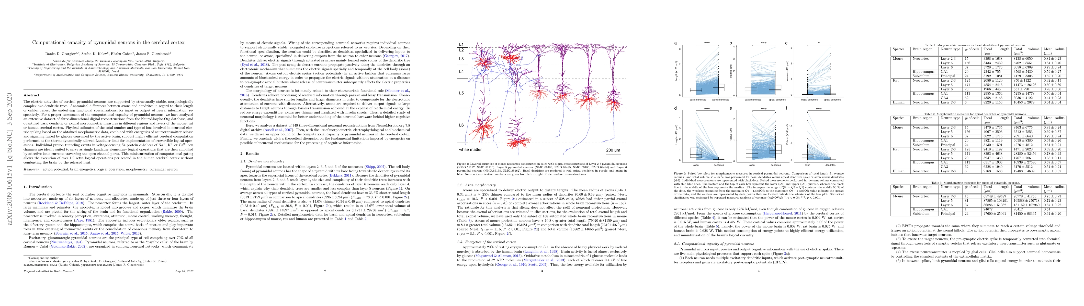 The electric activities of cortical pyramidal neurons are supported by structurally stable, morphologically complex axo-dendritic trees. Anatomical differences between axons and dendrites in regard to their length or caliber reflect the underlying functional specializations, for input or output of neural information, respectively. For a proper assessment of the computational capacity of pyramidal neurons, we have analyzed an extensive dataset of three-dimensional digital reconstructions from the NeuroMorpho.Org database, and quantified basic dendritic or axonal morphometric measures in different regions and layers of the mouse, rat or human cerebral cortex. Physical estimates of the total number and type of ions involved in neuronal electric spiking based on the obtained morphometric data, combined with energetics of neurotransmitter release and signaling fueled by glucose consumed by the active brain, support highly efficient cerebral computation performed at the thermodynamically allowed Landauer limit for implementation of irreversible logical operations. Individual proton tunneling events in voltage-sensing S4 protein $\alpha$-helices of Na$^{+}$, K$^{+}$ or Ca$^{2+}$ ion channels are ideally suited to serve as single Landauer elementary logical operations that are then amplified by selective ionic currents traversing the open channel pores. This miniaturization of computational gating allows the execution of over 1.2 zetta logical operations per second in the human cerebral cortex without combusting the brain by the released heat.