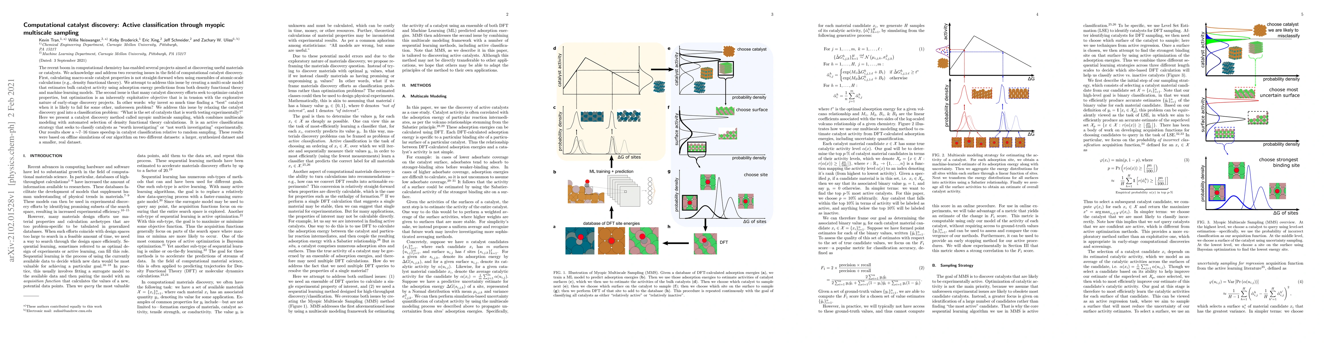 This paper introduces a computational catalyst discovery method called myopic multiscale sampling that combines multiscale modeling and machine learning to classify catalysts as "worth investigating" or "not worth investigating" experimentally. The approach addresses challenges in scaling atomic-scale calculations to macro-scale properties and provides a more explorative alternative to traditional optimization-focused discovery methods.