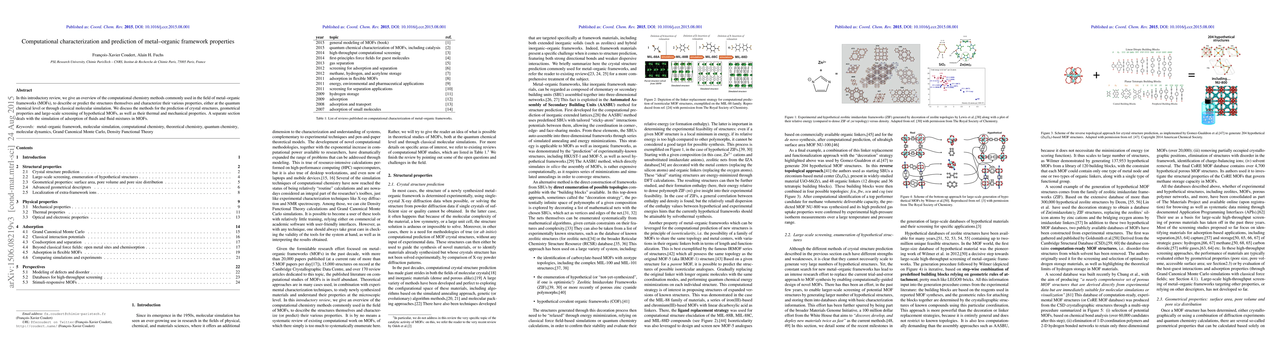 This review surveys computational methods for predicting and characterizing metal-organic framework (MOF) properties, including quantum chemical and classical molecular simulation techniques, focusing on crystal structures, geometrical properties, and adsorption behaviors. It also covers large-scale screening and simulations of thermal and mechanical properties.