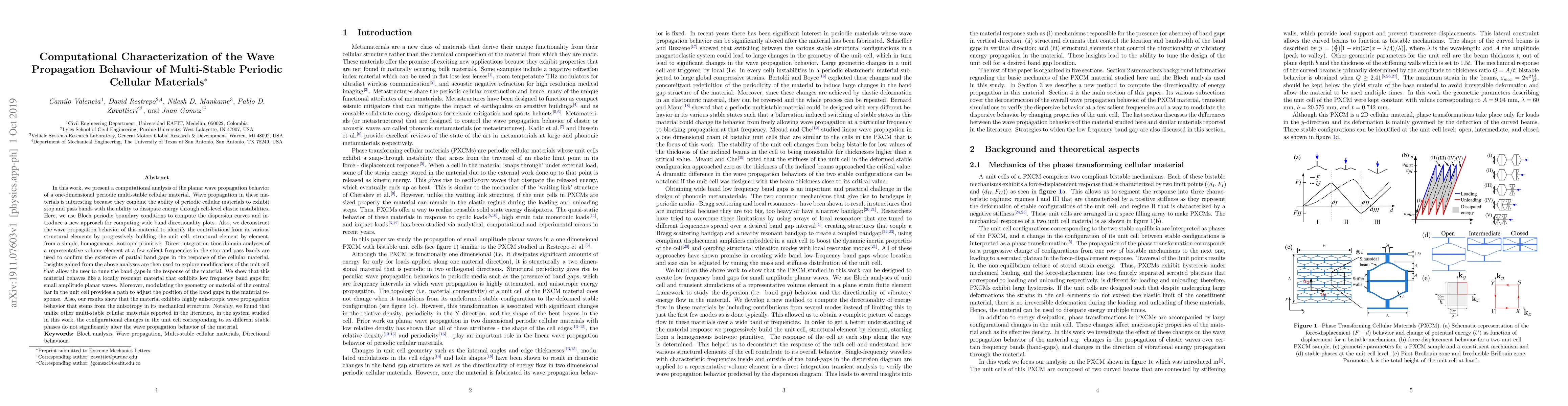 In this work, we present a computational analysis of the planar wave propagation behavior of a one-dimensional periodic multi-stable cellular material. Wave propagation in these materials is interesting because they combine the ability of periodic cellular materials to exhibit stop and pass bands with the ability to dissipate energy through cell-level elastic instabilities. Here, we use Bloch periodic boundary conditions to compute the dispersion curves and introduce a new approach for computing wide band directionality plots. Also, we deconstruct the wave propagation behavior of this material to identify the contributions from its various structural elements by progressively building the unit cell, structural element by element, from a simple, homogeneous, isotropic primitive. Direct integration time domain analyses of a representative volume element at a few salient frequencies in the stop and pass bands are used to confirm the existence of partial band gaps in the response of the cellular material. Insights gained from the above analyses are then used to explore modifications of the unit cell that allow the user to tune the band gaps in the response of the material. We show that this material behaves like a locally resonant material that exhibits low frequency band gaps for small amplitude planar waves. Moreover, modulating the geometry or material of the central bar in the unit cell provides a path to adjust the position of the band gaps in the material response.