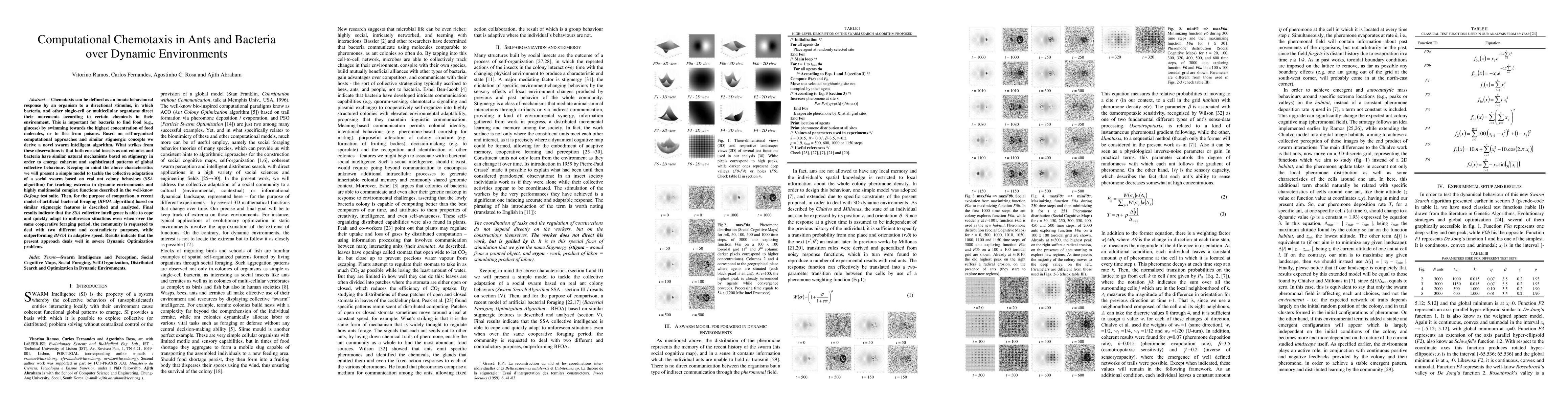 Chemotaxis can be defined as an innate behavioural response by an organism to a directional stimulus, in which bacteria, and other single-cell or multicellular organisms direct their movements according to certain chemicals in their environment. This is important for bacteria to find food (e.g., glucose) by swimming towards the highest concentration of food molecules, or to flee from poisons. Based on self-organized computational approaches and similar stigmergic concepts we derive a novel swarm intelligent algorithm. What strikes from these observations is that both eusocial insects as ant colonies and bacteria have similar natural mechanisms based on stigmergy in order to emerge coherent and sophisticated patterns of global collective behaviour. Keeping in mind the above characteristics we will present a simple model to tackle the collective adaptation of a social swarm based on real ant colony behaviors (SSA algorithm) for tracking extrema in dynamic environments and highly multimodal complex functions described in the well-know De Jong test suite. Later, for the purpose of comparison, a recent model of artificial bacterial foraging (BFOA algorithm) based on similar stigmergic features is described and analyzed. Final results indicate that the SSA collective intelligence is able to cope and quickly adapt to unforeseen situations even when over the same cooperative foraging period, the community is requested to deal with two different and contradictory purposes, while outperforming BFOA in adaptive speed. Results indicate that the present approach deals well in severe Dynamic Optimization problems.
