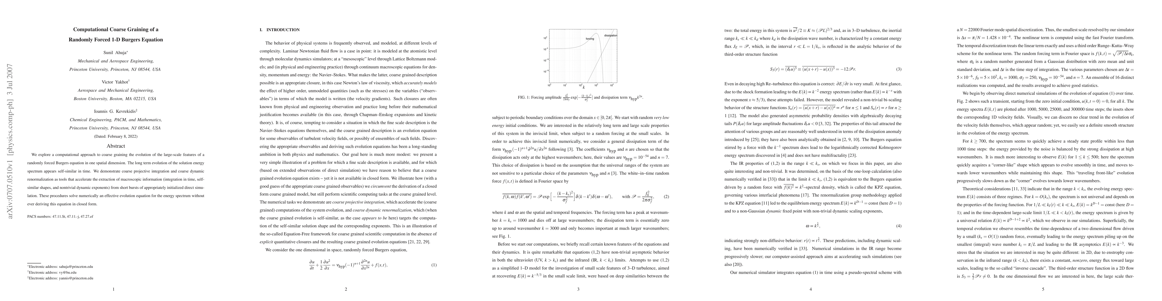 This paper investigates computational methods for coarse graining the large-scale features of a randomly forced 1-D Burgers equation, demonstrating self-similar energy spectrum evolution over time. It employs coarse projective integration and coarse dynamic renormalization to extract macroscopic information efficiently from short simulations.
