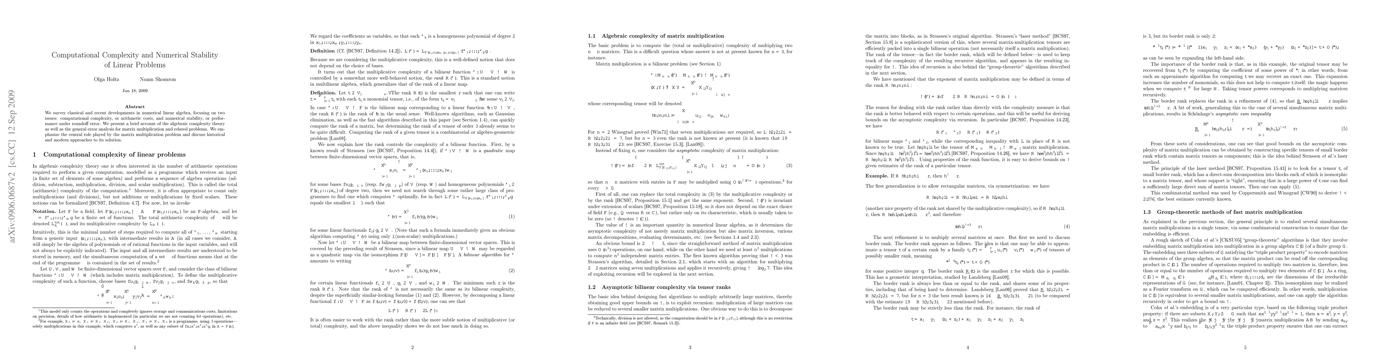 This paper surveys advancements in numerical linear algebra, emphasizing computational complexity and numerical stability, and discusses the matrix multiplication problem's significance and various approaches to solving it, including algebraic complexity theory and error analysis.
