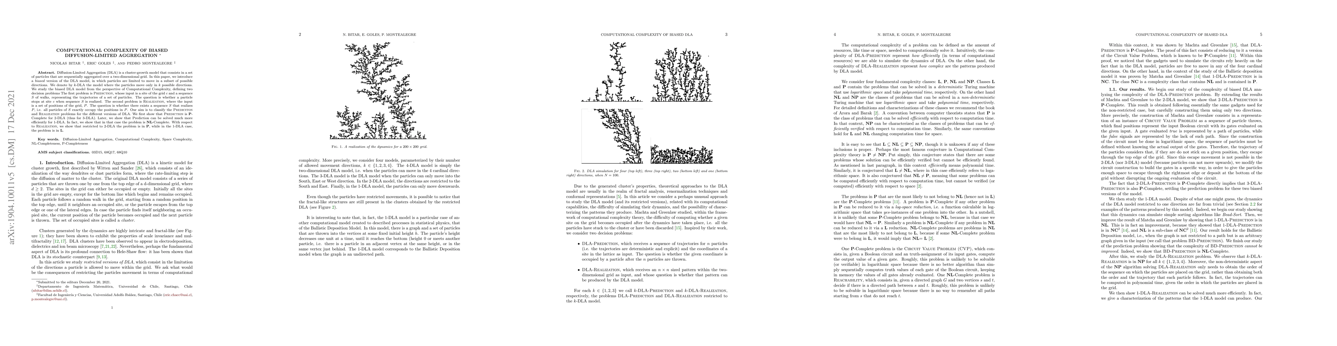 Diffusion-Limited Aggregation (DLA) is a cluster-growth model that consists in a set of particles that are sequentially aggregated over a two-dimensional grid. In this paper, we introduce a biased version of the DLA model, in which particles are limited to move in a subset of possible directions. We denote by $k$-DLA the model where the particles move only in $k$ possible directions. We study the biased DLA model from the perspective of Computational Complexity, defining two decision problems The first problem is Prediction, whose input is a site of the grid $c$ and a sequence $S$ of walks, representing the trajectories of a set of particles. The question is whether a particle stops at site $c$ when sequence $S$ is realized. The second problem is Realization, where the input is a set of positions of the grid, $P$. The question is whether there exists a sequence $S$ that realizes $P$, i.e. all particles of $S$ exactly occupy the positions in $P$. Our aim is to classify the Prediciton and Realization problems for the different versions of DLA. We first show that Prediction is P-Complete for 2-DLA (thus for 3-DLA). Later, we show that Prediction can be solved much more efficiently for 1-DLA. In fact, we show that in that case the problem is NL-Complete. With respect to Realization, we show that restricted to 2-DLA the problem is in P, while in the 1-DLA case, the problem is in L.