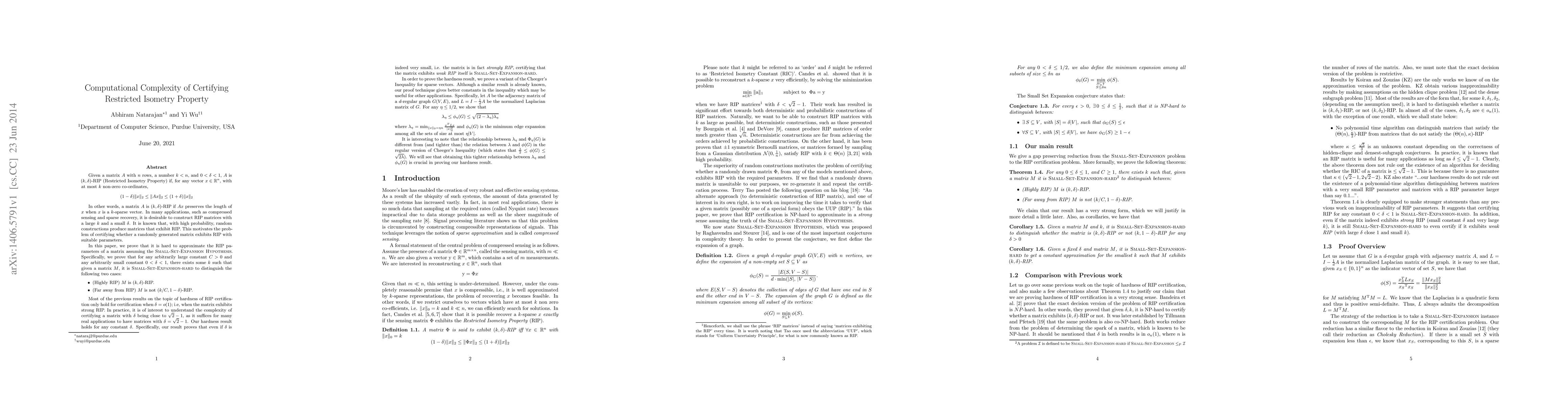 This paper proves the computational complexity of certifying the Restricted Isometry Property (RIP) for matrices under the Small-Set-Expansion-Hypothesis, showing it is hard to approximate RIP parameters even for small $\delta$. It establishes that distinguishing between a matrix being $(k,\delta)$-RIP and not $(k/C, 1-\delta)$-RIP is SSE-Hard.