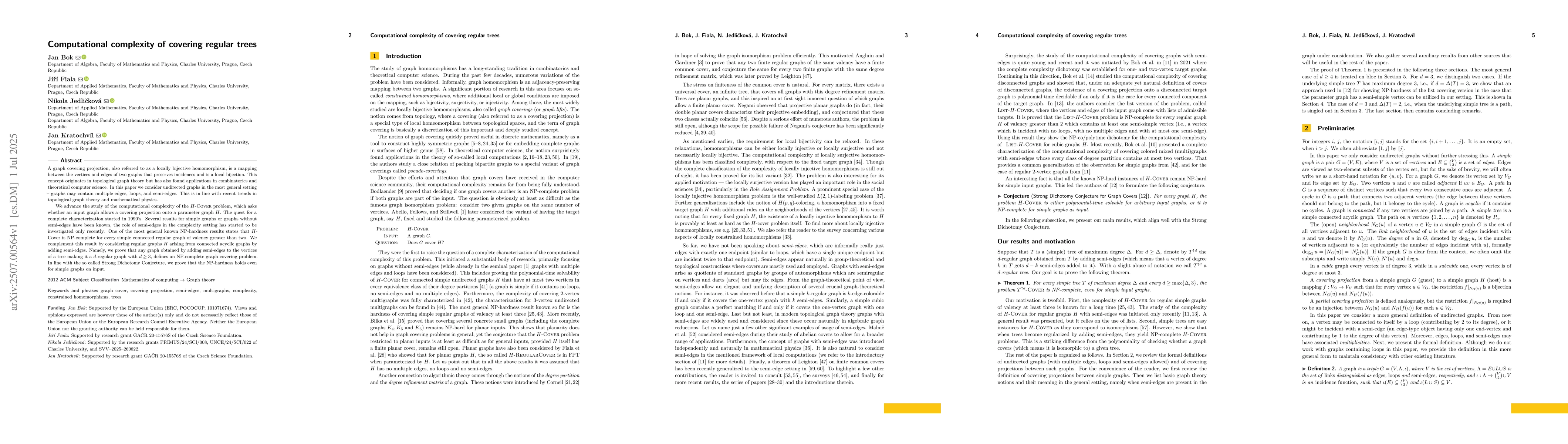 A graph covering projection, also referred to as a locally bijective homomorphism, is a mapping between the vertices and edges of two graphs that preserves incidences and is a local bijection. This concept originates in topological graph theory but has also found applications in combinatorics and theoretical computer science. In this paper we consider undirected graphs in the most general setting -- graphs may contain multiple edges, loops, and semi-edges. This is in line with recent trends in topological graph theory and mathematical physics. We advance the study of the computational complexity of the {\sc $H$-Cover} problem, which asks whether an input graph allows a covering projection onto a parameter graph $H$. The quest for a complete characterization started in 1990's. Several results for simple graphs or graphs without semi-edges have been known, the role of semi-edges in the complexity setting has started to be investigated only recently. One of the most general known NP-hardness results states that {\sc $H$}-Cover is NP-complete for every simple connected regular graph of valency greater than two. We complement this result by considering regular graphs $H$ arising from connected acyclic graphs by adding semi-edges. Namely, we prove that any graph obtained by adding semi-edges to the vertices of a tree making it a $d$-regular graph with $d \geq 3$, defines an NP-complete graph covering problem. In line with the so called Strong Dichotomy Conjecture, we prove that the NP-hardness holds even for simple graphs on input.