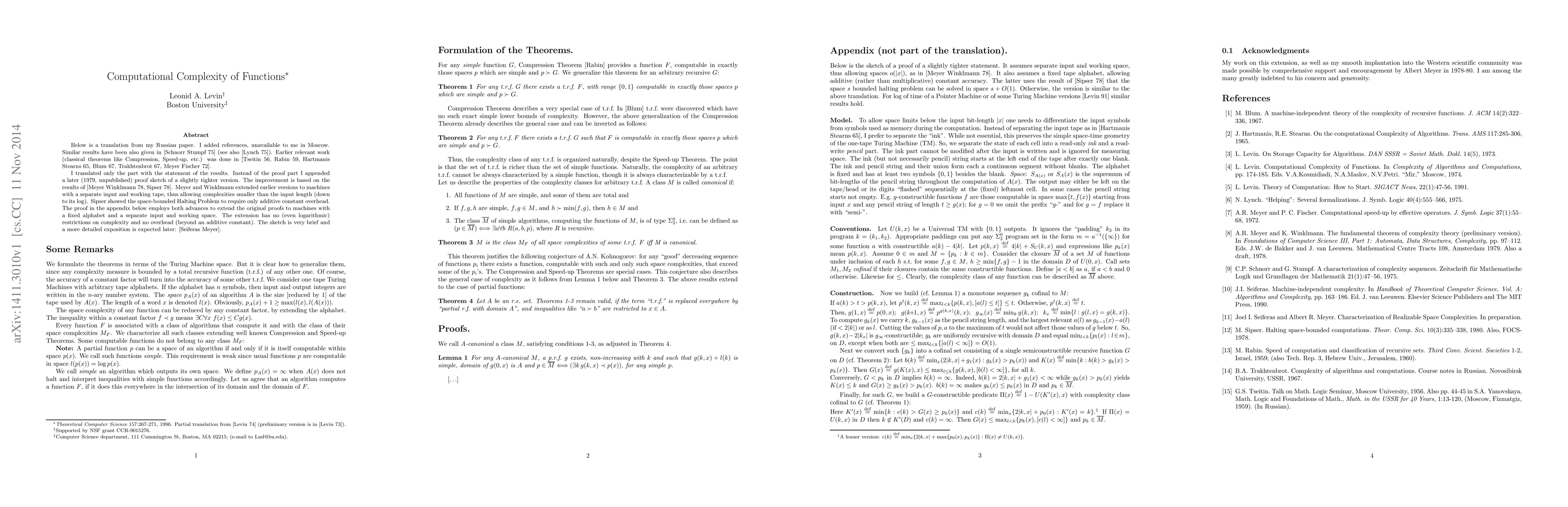 Below is a translation from my Russian paper. I added references, unavailable to me in Moscow. Similar results have been also given in [Schnorr Stumpf 75] (see also [Lynch 75]). Earlier relevant work (classical theorems like Compression, Speed-up, etc.) was done in [Tseitin 56, Rabin 59, Hartmanis Stearns 65, Blum 67, Trakhtenbrot 67, Meyer Fischer 72]. I translated only the part with the statement of the results. Instead of the proof part I appended a later (1979, unpublished) proof sketch of a slightly tighter version. The improvement is based on the results of [Meyer Winklmann 78, Sipser 78]. Meyer and Winklmann extended earlier versions to machines with a separate input and working tape, thus allowing complexities smaller than the input length (down to its log). Sipser showed the space-bounded Halting Problem to require only additive constant overhead. The proof in the appendix below employs both advances to extend the original proofs to machines with a fixed alphabet and a separate input and working space. The extension has no (even logarithmic) restrictions on complexity and no overhead (beyond an additive constant). The sketch is very brief and a more detailed exposition is expected later: [Seiferas Meyer].
