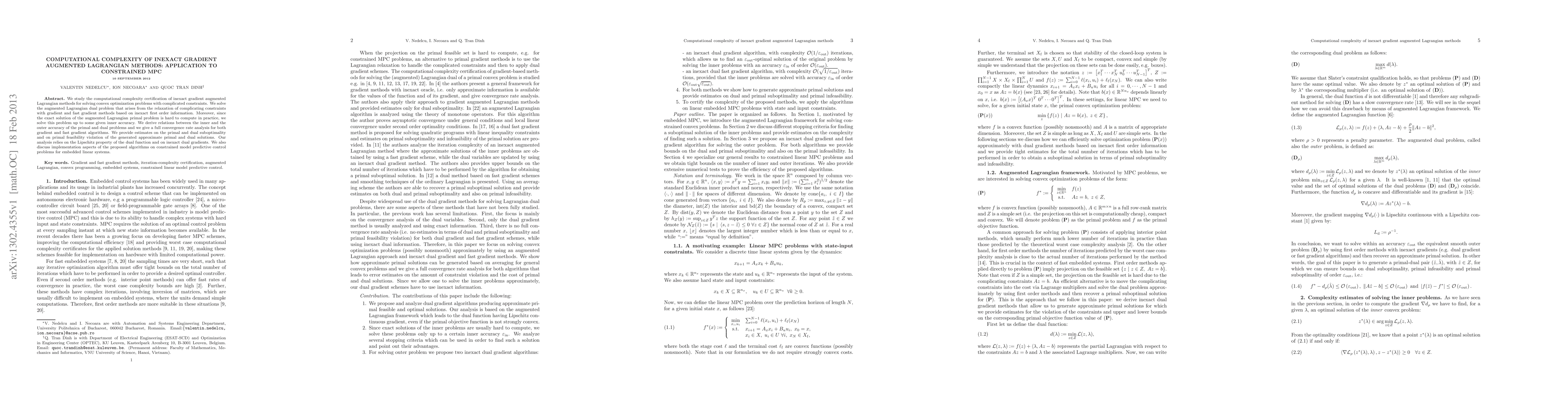 This paper certifies the computational complexity of inexact gradient augmented Lagrangian methods for solving convex optimization problems with complex constraints. It provides convergence rate analysis and estimates on suboptimality and feasibility, focusing on implementation for constrained model predictive control.