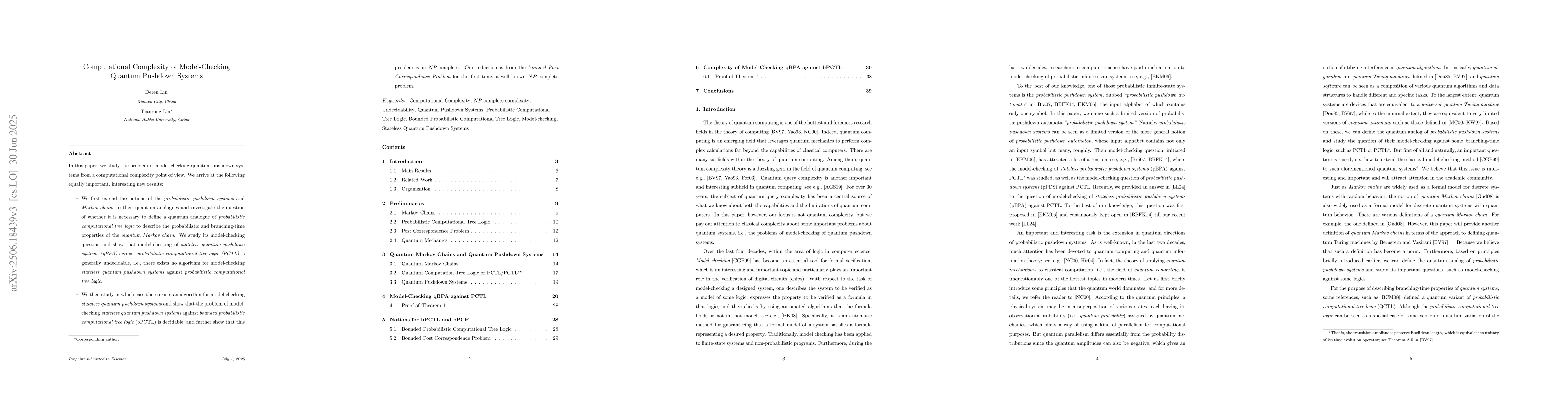 In this paper, we study the problem of model-checking quantum pushdown systems from a computational complexity point of view. We arrive at the following equally important, interesting new results: We first extend the notions of the {\it probabilistic pushdown systems} and {\it Markov chains} to their quantum analogues and investigate the question of whether it is necessary to define a quantum analogue of {\it probabilistic computational tree logic} to describe the probabilistic and branching-time properties of the {\it quantum Markov chain}. We study its model-checking question and show that model-checking of {\it stateless quantum pushdown systems (qBPA)} against {\it probabilistic computational tree logic (PCTL)} is generally undecidable, i.e., there exists no algorithm for model-checking {\it stateless quantum pushdown systems} against {\it probabilistic computational tree logic}. We then study in which case there exists an algorithm for model-checking {\it stateless quantum pushdown systems} and show that the problem of model-checking {\it stateless quantum pushdown systems} against {\it bounded probabilistic computational tree logic} (bPCTL) is decidable, and further show that this problem is in $NP$-complete. Our reduction is from the {\it bounded Post Correspondence Problem} for the first time, a well-known $NP$-complete problem.