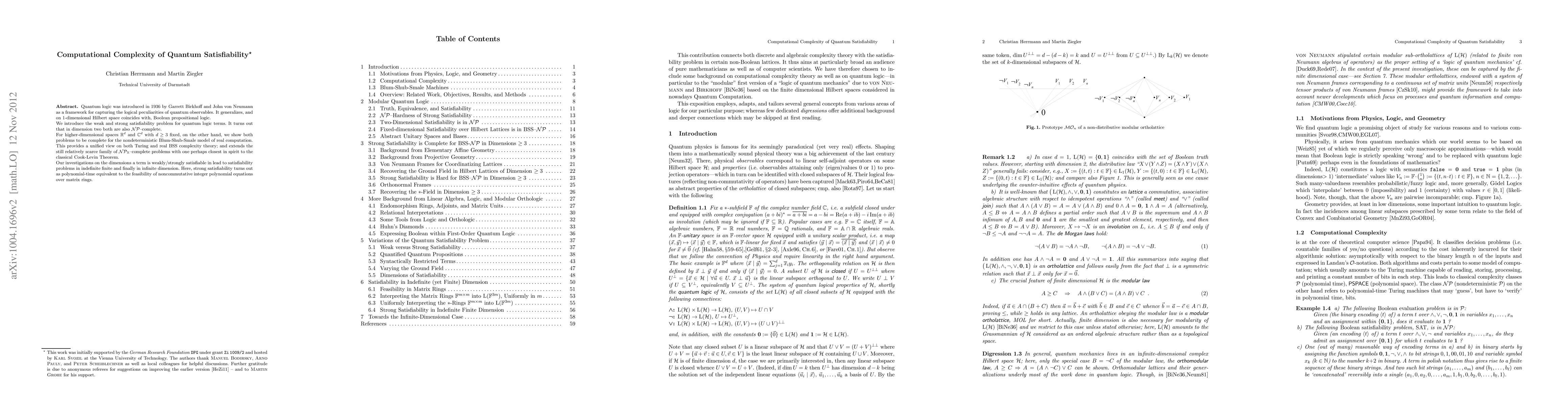 Quantum logic was introduced in 1936 by Garrett Birkhoff and John von Neumann as a framework for capturing the logical peculiarities of quantum observables. It generalizes, and on 1-dimensional Hilbert space coincides with, Boolean propositional logic. We introduce the weak and strong satisfiability problem for quantum logic terms. It turns out that in dimension two both are also NP-complete. For higher-dimensional spaces R^d and C^d with d>2 fixed, on the other hand, we show both problems to be complete for the nondeterministic Blum-Shub-Smale model of real computation. This provides a unified view on both Turing and real BSS complexity theory; and extends the still relatively scarce family of NP_R-complete problems with one perhaps closest in spirit to the classical Cook-Levin Theorem. Our investigations on the dimensions a term is weakly/strongly satisfiable in lead to satisfiability problems in indefinite finite and finally in infinite dimension. Here, strong satisfiability turns out as polynomial-time equivalent to the feasibility of noncommutative integer polynomial equations