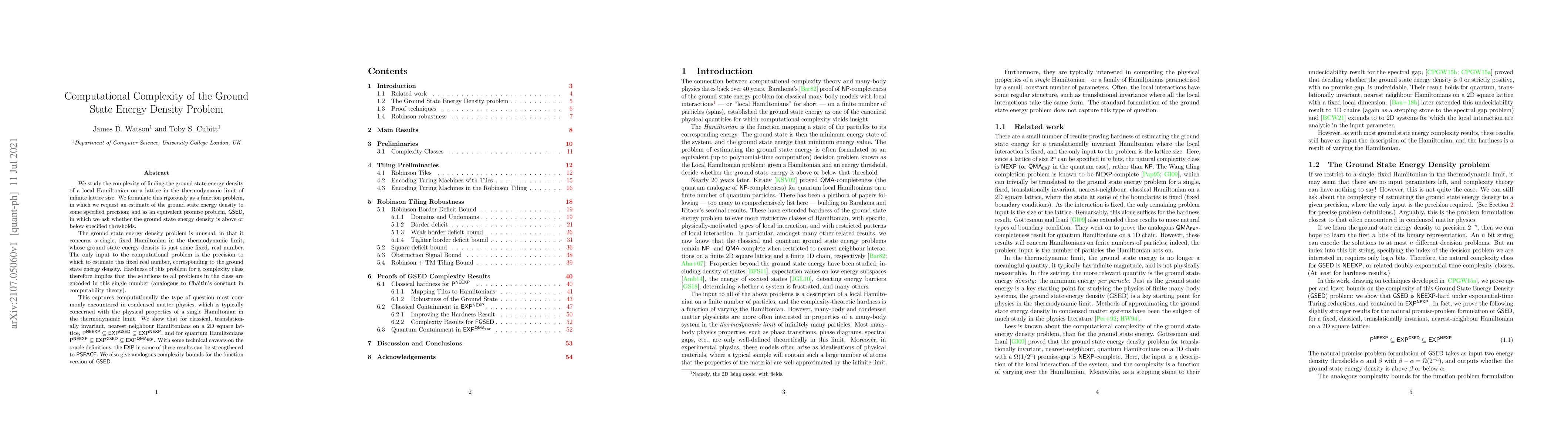 We study the complexity of finding the ground state energy density of a local Hamiltonian on a lattice in the thermodynamic limit of infinite lattice size. We formulate this rigorously as a function problem, in which we request an estimate of the ground state energy density to some specified precision; and as an equivalent promise problem, $\mathsf{GSED}$, in which we ask whether the ground state energy density is above or below specified thresholds. The ground state energy density problem is unusual, in that it concerns a single, fixed Hamiltonian in the thermodynamic limit, whose ground state energy density is just some fixed, real number. The only input to the computational problem is the precision to which to estimate this fixed real number, corresponding to the ground state energy density. Hardness of this problem for a complexity class therefore implies that the solutions to all problems in the class are encoded in this single number (analogous to Chaitin's constant in computability theory). This captures computationally the type of question most commonly encountered in condensed matter physics, which is typically concerned with the physical properties of a single Hamiltonian in the thermodynamic limit. We show that for classical, translationally invariant, nearest neighbour Hamiltonians on a 2D square lattice, $\mathsf{P}^{\mathsf{NEEXP}}\subseteq\mathsf{EXP}^{\mathsf{GSED}}\subseteq \mathsf{EXP}^{\mathsf{NEXP}}$, and for quantum Hamiltonians $\mathsf{P}^{\mathsf{NEEXP}}\subseteq\mathsf{EXP}^{\mathsf{GSED}}\subseteq \mathsf{EXP}^{\mathsf{QMA}_{EXP}}$. With some technical caveats on the oracle definitions, the $\mathsf{EXP}$ in some of these results can be strengthened to $\mathsf{PSPACE}$. We also give analogous complexity bounds for the function version of $\mathsf{GSED}$.