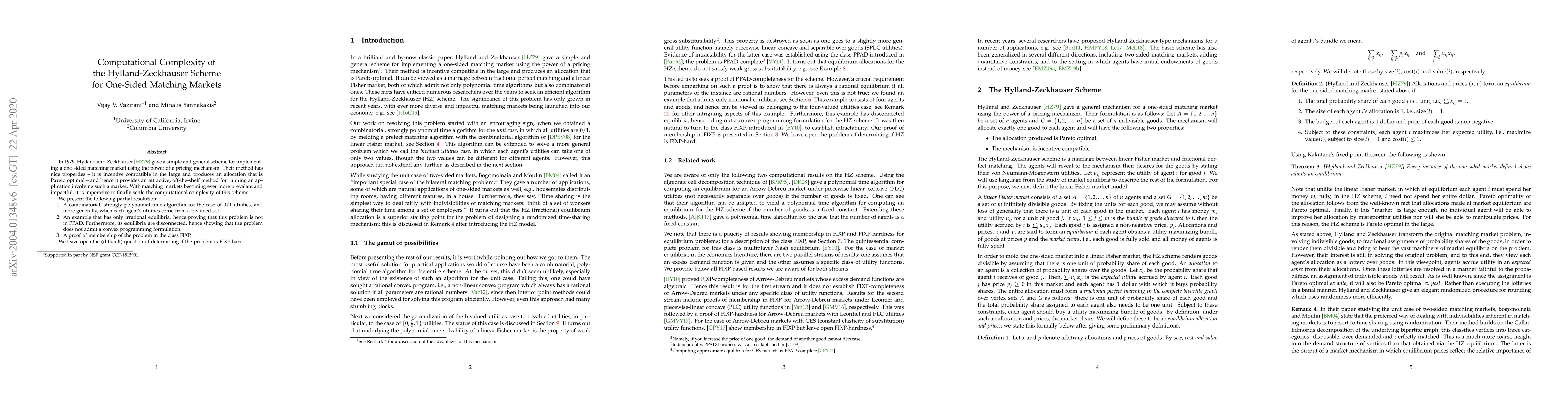 In 1979, Hylland and Zeckhauser \cite{hylland} gave a simple and general scheme for implementing a one-sided matching market using the power of a pricing mechanism. Their method has nice properties -- it is incentive compatible in the large and produces an allocation that is Pareto optimal -- and hence it provides an attractive, off-the-shelf method for running an application involving such a market. With matching markets becoming ever more prevalant and impactful, it is imperative to finally settle the computational complexity of this scheme. We present the following partial resolution: 1. A combinatorial, strongly polynomial time algorithm for the special case of $0/1$ utilities. 2. An example that has only irrational equilibria, hence proving that this problem is not in PPAD. Furthermore, its equilibria are disconnected, hence showing that the problem does not admit a convex programming formulation. 3. A proof of membership of the problem in the class FIXP. We leave open the (difficult) question of determining if the problem is FIXP-hard. Settling the status of the special case when utilities are in the set $\{0, {\frac 1 2}, 1 \}$ appears to be even more difficult.