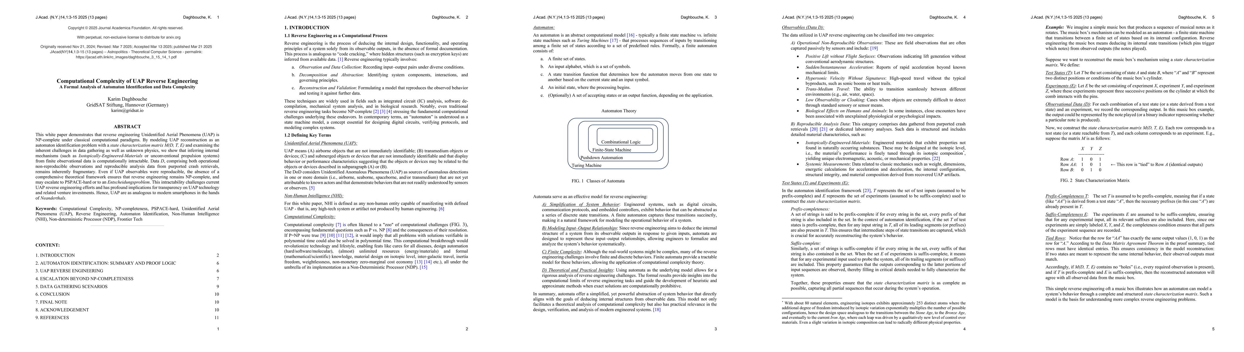 Provides a formal analysis of data complexity in UAP reverse engineering, showing its intractability and implications for technology transparency.