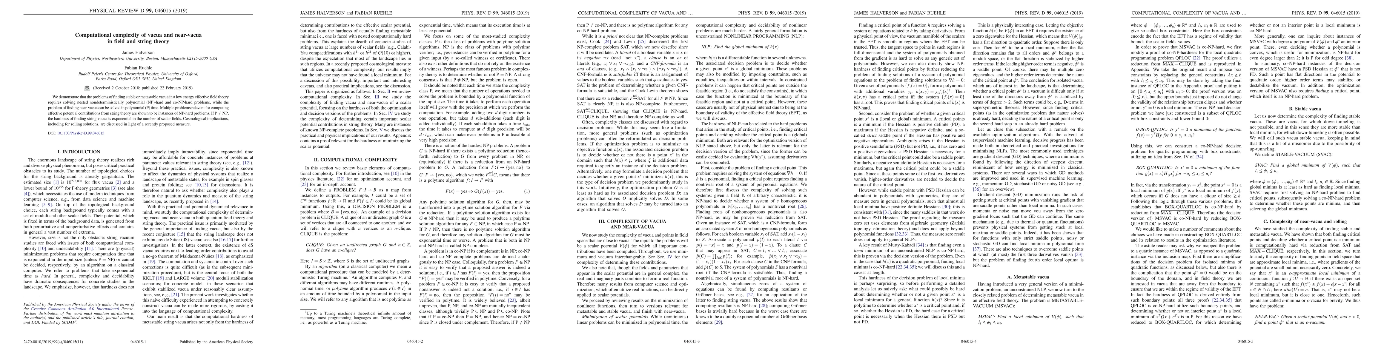 This paper investigates the computational complexity of identifying stable or metastable vacua in low energy effective field theory and string theory, revealing nested NP-hard and co-NP-hard problems, while finding near-vacua is in P. Under the assumption P ≠ NP, it concludes that computing string vacua contributions is exponentially hard, with implications for cosmological rolling solutions.