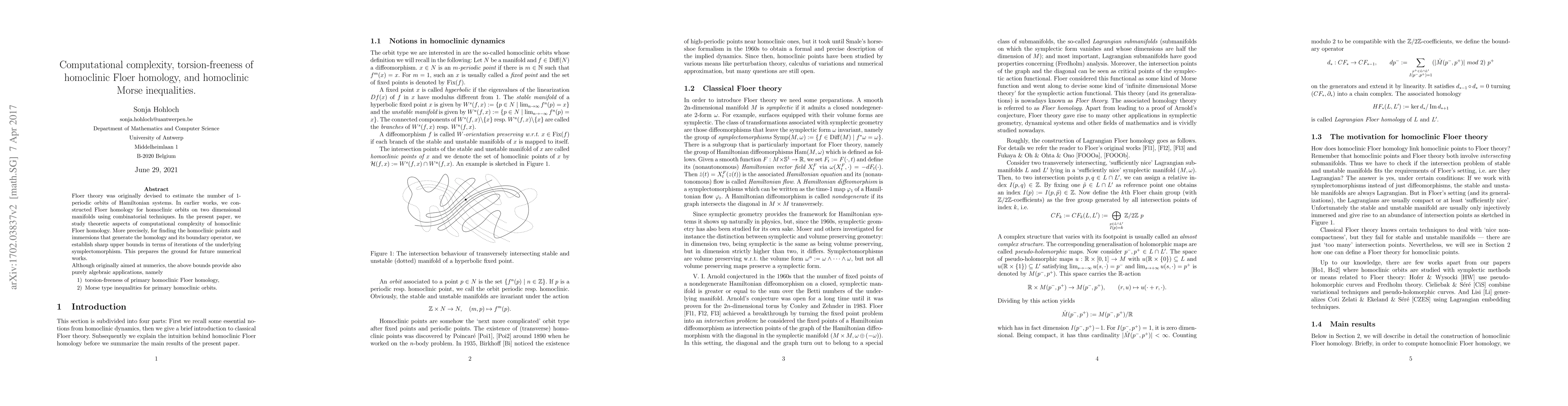 This paper explores the computational complexity of homoclinic Floer homology for 2D manifolds, establishing sharp upper bounds for generating homoclinic points and immersions. It also demonstrates algebraic applications, including torsion-freeness of primary homoclinic Floer homology and Morse-type inequalities for primary homoclinic orbits.