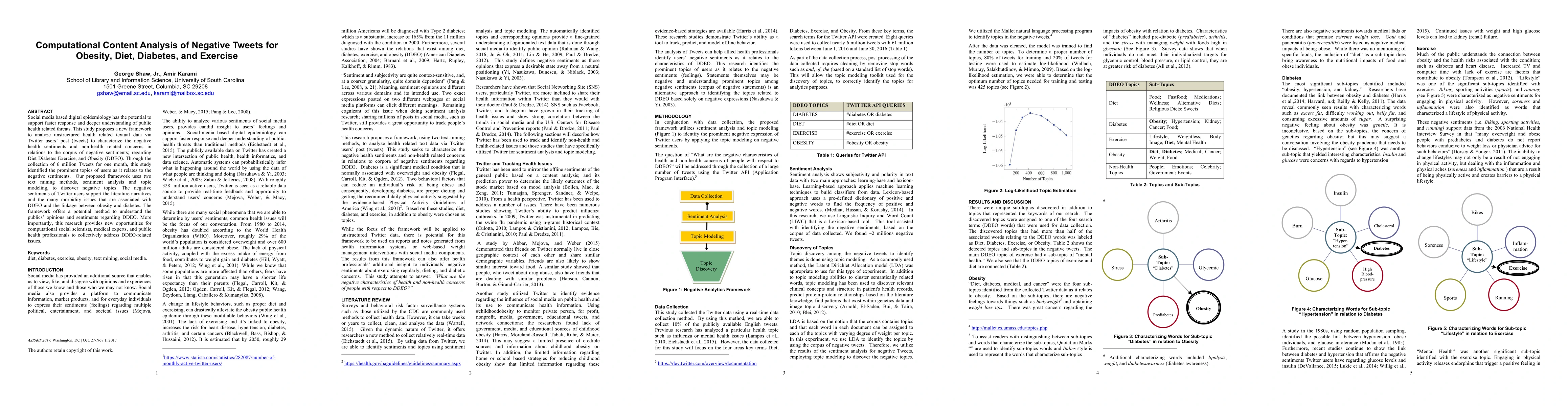This study develops a framework for analyzing negative sentiments in Twitter posts related to obesity, diet, diabetes, and exercise, using sentiment analysis and topic modeling. The research identifies prominent negative topics and provides insights into public opinions, aiding public health professionals and medical experts in addressing these health issues.