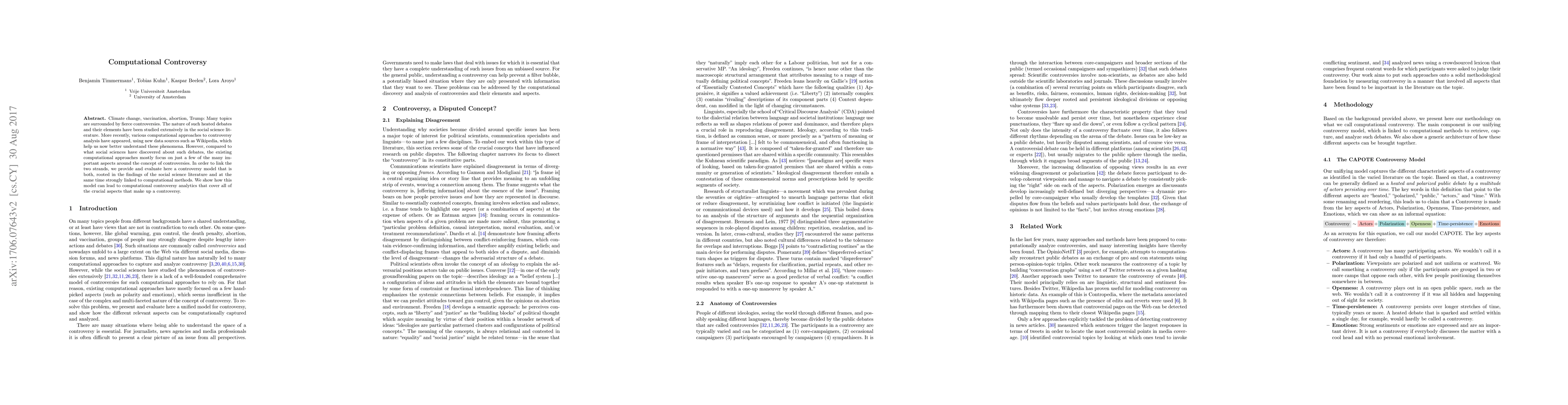 Climate change, vaccination, abortion, Trump: Many topics are surrounded by fierce controversies. The nature of such heated debates and their elements have been studied extensively in the social science literature. More recently, various computational approaches to controversy analysis have appeared, using new data sources such as Wikipedia, which help us now better understand these phenomena. However, compared to what social sciences have discovered about such debates, the existing computational approaches mostly focus on just a few of the many important aspects around the concept of controversies. In order to link the two strands, we provide and evaluate here a controversy model that is both, rooted in the findings of the social science literature and at the same time strongly linked to computational methods. We show how this model can lead to computational controversy analytics that have full coverage over all the crucial aspects that make up a controversy.