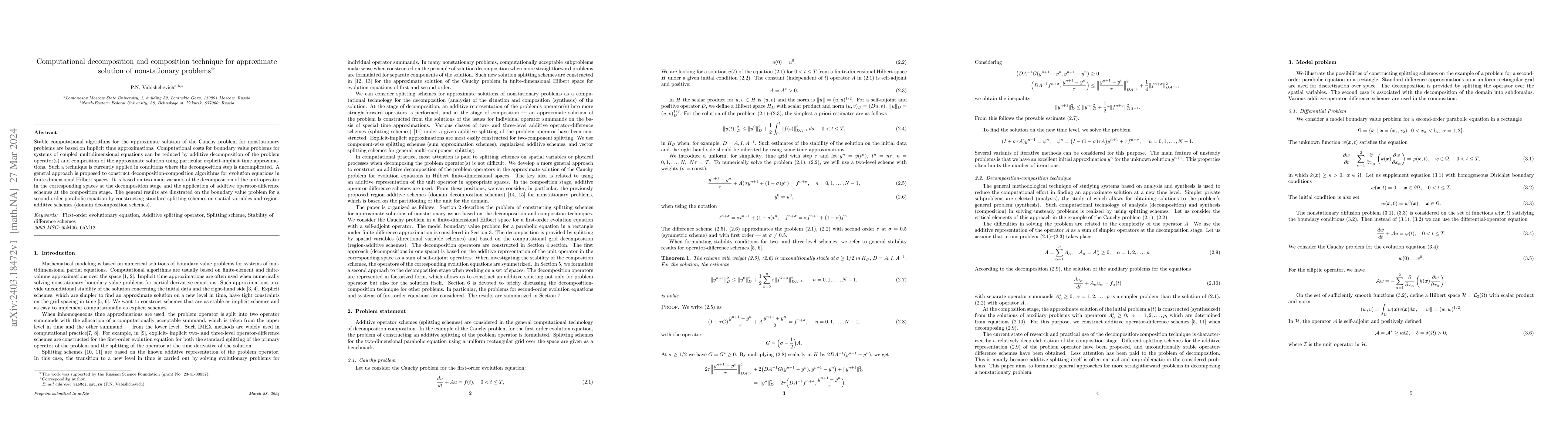 This paper proposes a computational decomposition-composition technique to efficiently solve nonstationary problems using implicit time approximations. It introduces a general method for constructing algorithms in finite-dimensional Hilbert spaces, illustrated through standard splitting and region-additive schemes for a second-order parabolic equation.