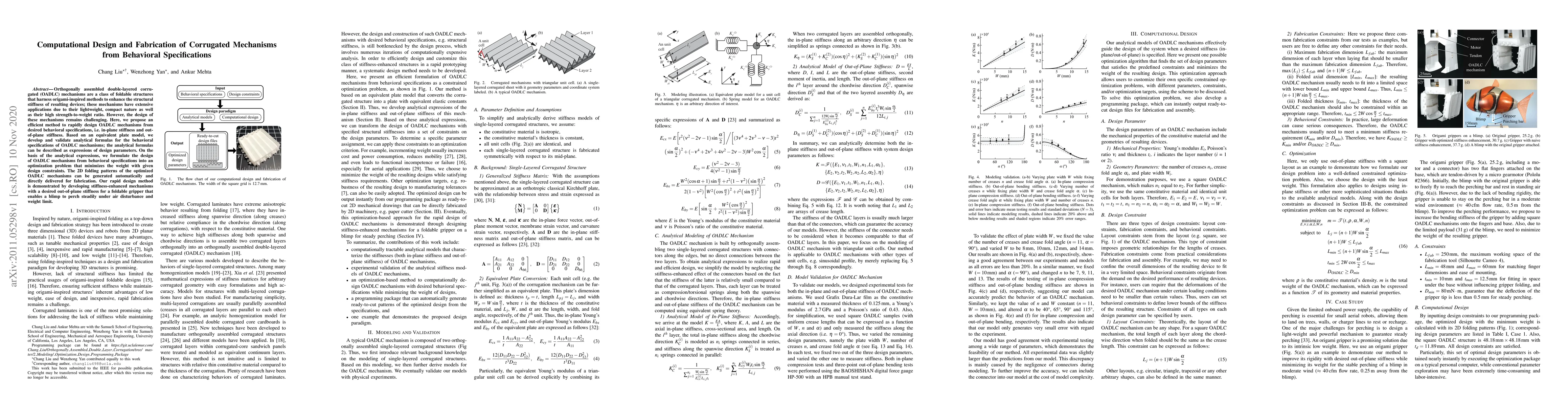 Orthogonally assembled double-layered corrugated (OADLC) mechanisms are a class of foldable structures that harness origami-inspired methods to enhance the structural stiffness of resulting devices; these mechanisms have extensive applications due to their lightweight, compact nature as well as their high strength-to-weight ratio. However, the design of these mechanisms remains challenging. Here, we propose an efficient method to rapidly design OADLC mechanisms from desired behavioral specifications, i.e. in-plane stiffness and out-of-plane stiffness. Based on an equivalent plate model, we develop and validate analytical formulas for the behavioral specifications of OADLC mechanisms; the analytical formulas can be described as expressions of design parameters. On the basis of the analytical expressions, we formulate the design of OADLC mechanisms from behavioral specifications into an optimization problem that minimizes the weight with given design constraints. The 2D folding patterns of the optimized OADLC mechanisms can be generated automatically and directly delivered for fabrication. Our rapid design method is demonstrated by developing stiffness-enhanced mechanisms with a desired out-of-plane stiffness for a foldable gripper that enables a blimp to perch steadily under air disturbance and weight limit.