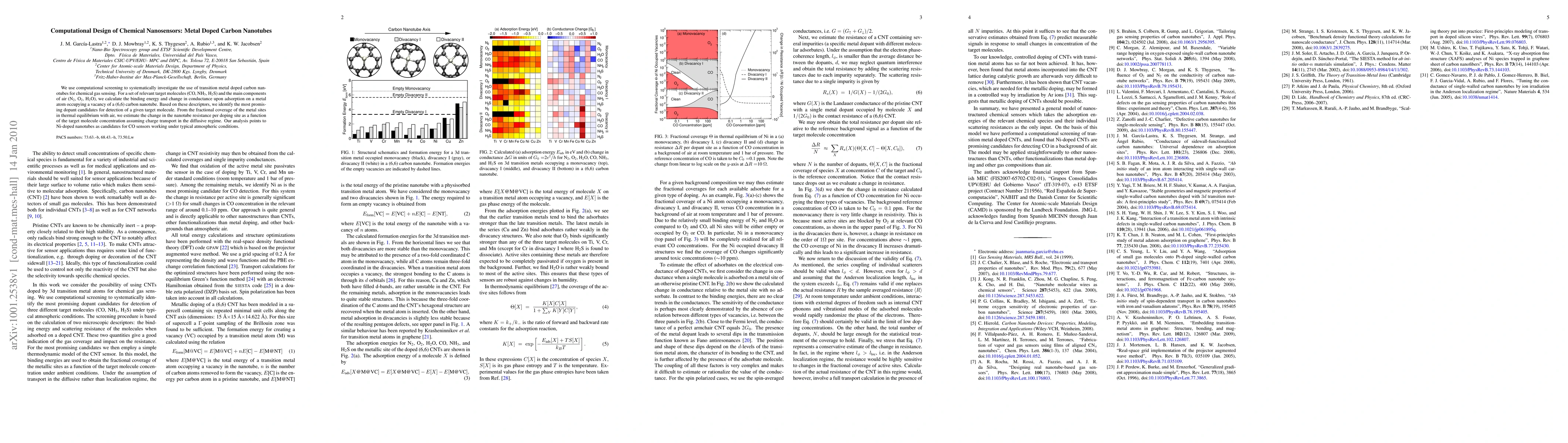 This paper employs computational methods to explore transition metal doped carbon nanotubes for chemical gas sensing, identifying Ni-doped nanotubes as optimal for CO detection under atmospheric conditions based on binding energy and conductance changes.
