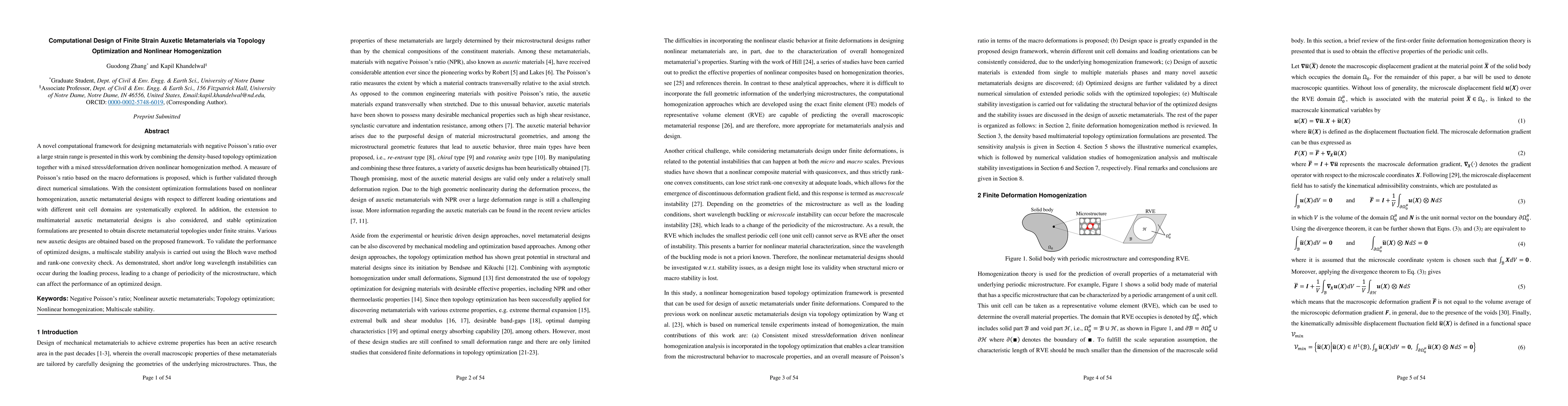 This paper presents a computational framework combining topology optimization and nonlinear homogenization to design finite strain auxetic metamaterials with negative Poisson's ratio. The framework is validated through numerical simulations and stability analysis, revealing potential instabilities affecting optimized designs.