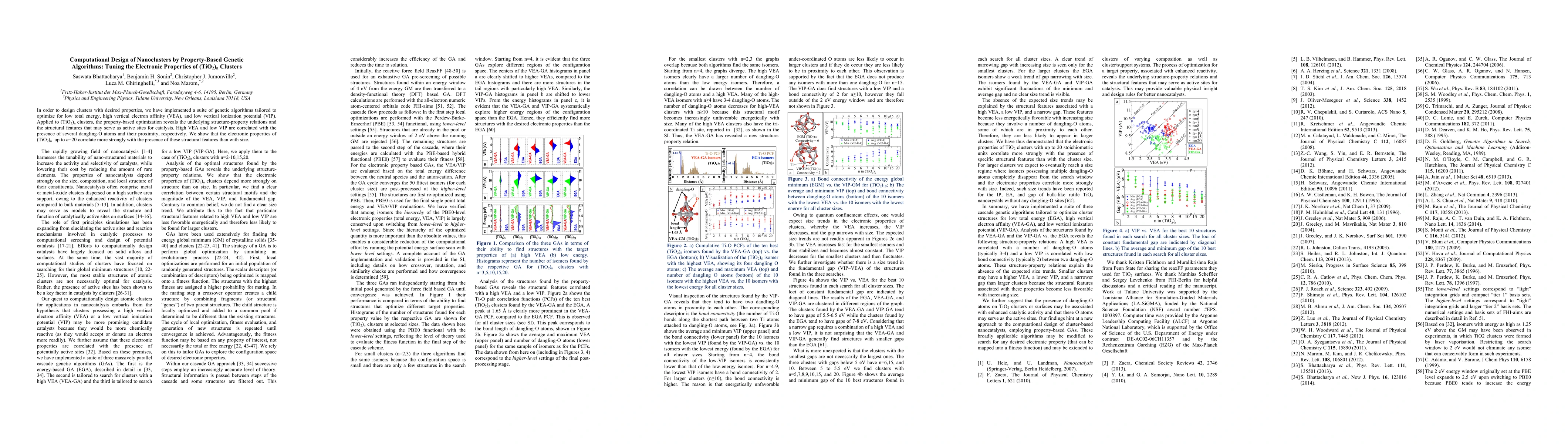 This paper uses genetic algorithms to computationally design (TiO$_2$)$_n$ nanoclusters optimized for low energy, high electron affinity, and low ionization potential. The study reveals that clusters with desirable electronic properties exhibit specific structural features, such as dangling-O atoms, which are more influential than size alone.