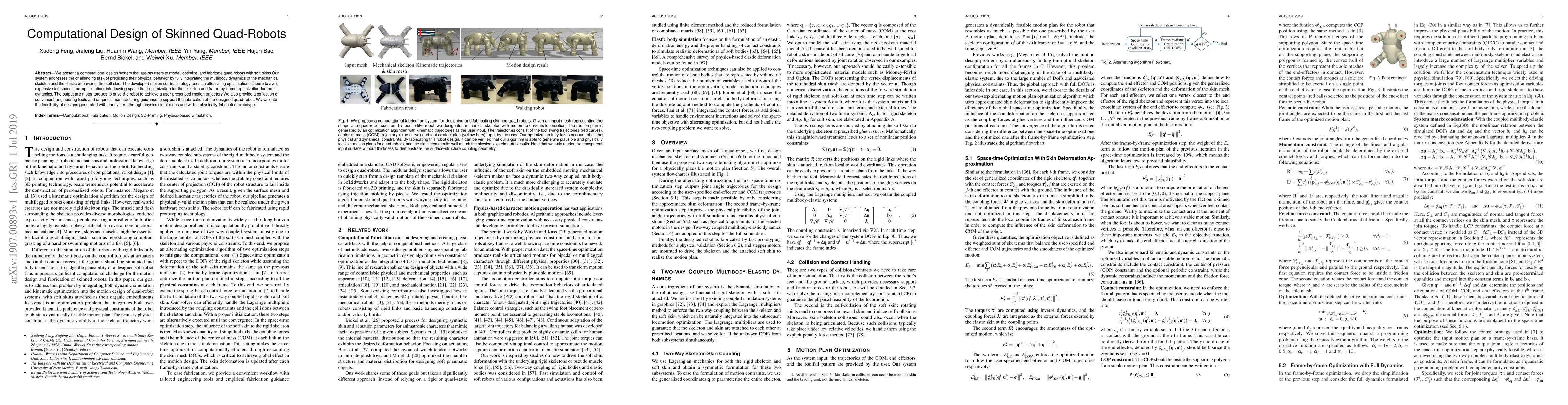 We present a computational design system that assists users to model, optimize, and fabricate quad-robots with soft skins.Our system addresses the challenging task of predicting their physical behavior by fully integrating the multibody dynamics of the mechanical skeleton and the elastic behavior of the soft skin. The developed motion control strategy uses an alternating optimization scheme to avoid expensive full space time-optimization, interleaving space-time optimization for the skeleton and frame-by-frame optimization for the full dynamics. The output are motor torques to drive the robot to achieve a user prescribed motion trajectory.We also provide a collection of convenient engineering tools and empirical manufacturing guidance to support the fabrication of the designed quad-robot. We validate the feasibility of designs generated with our system through physics simulations and with a physically-fabricated prototype.