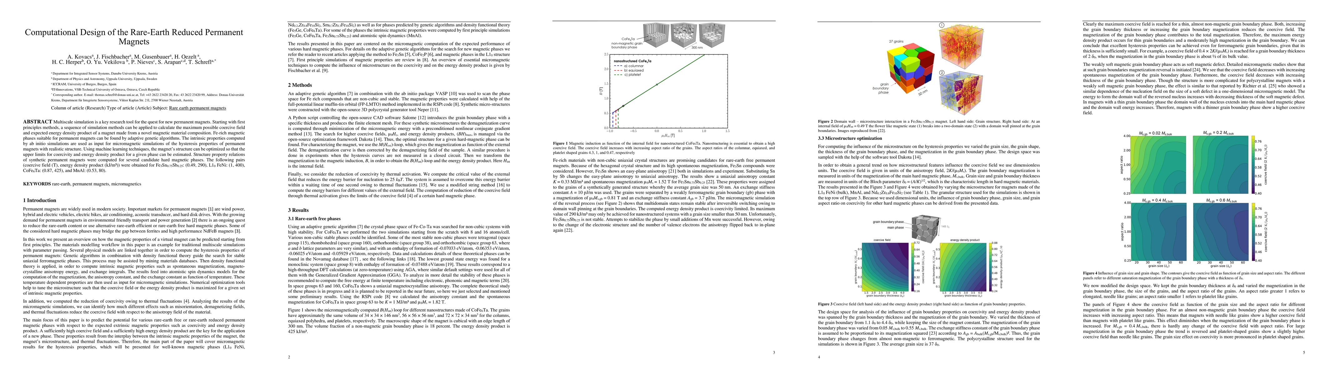 Multiscale simulation is a key research tool for the quest for new permanent magnets. Starting with first principles methods, a sequence of simulation methods can be applied to calculate the maximum possible coercive field and expected energy density product of a magnet made from a novel magnetic material composition. Fe-rich magnetic phases suitable for permanent magnets can be found by adaptive genetic algorithms. The intrinsic properties computed by ab initio simulations are used as input for micromagnetic simulations of the hysteresis properties of permanent magnets with realistic structure. Using machine learning techniques, the magnet's structure can be optimized so that the upper limits for coercivity and energy density product for a given phase can be estimated. Structure property relations of synthetic permanent magnets were computed for several candidate hard magnetic phases. The following pairs (coercive field (T), energy density product (kJ/m3)) were obtained for Fe3Sn0.75Sb0.25: (0.49, 290), L10 FeNi: (1, 400), CoFe6Ta: (0.87, 425), and MnAl: (0.53, 80).