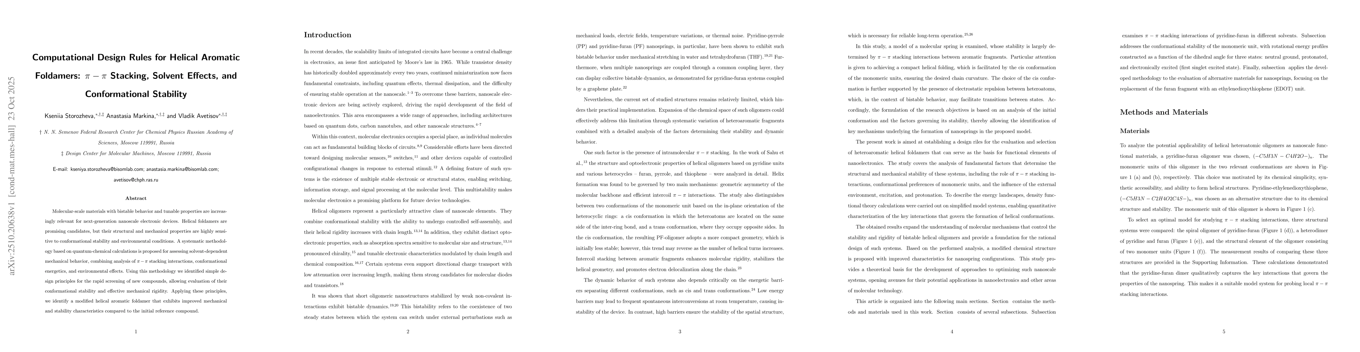 A systematic approach combining quantum-chemical calculations to analyze π-π stacking interactions, conformational energetics, and solvent effects on mechanical behavior of helical aromatic foldamers.