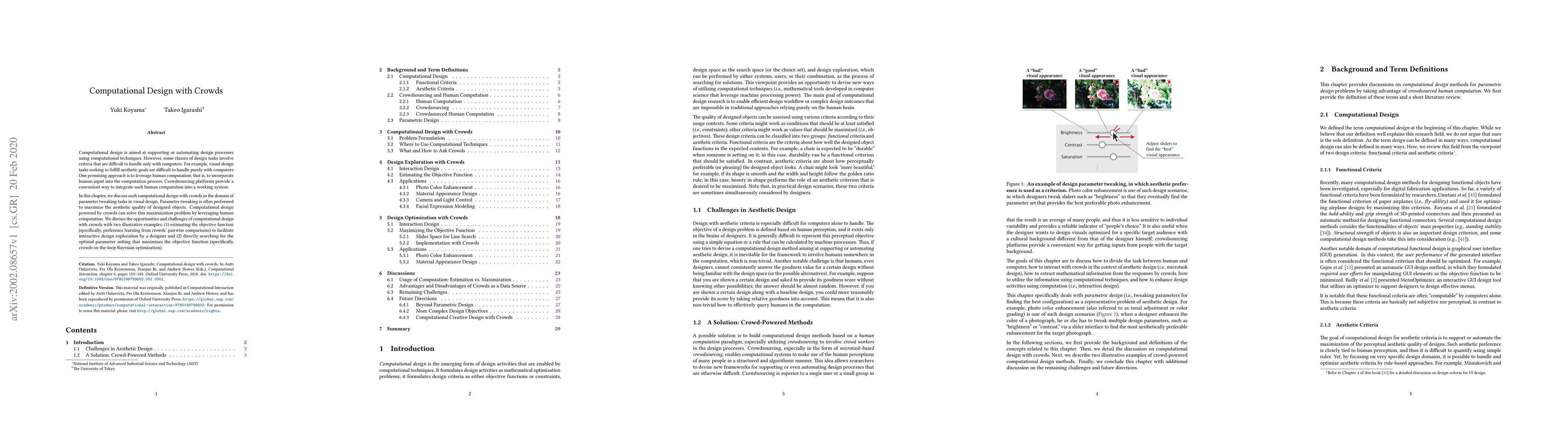 Computational design is aimed at supporting or automating design processes using computational techniques. However, some classes of design tasks involve criteria that are difficult to handle only with computers. For example, visual design tasks seeking to fulfill aesthetic goals are difficult to handle purely with computers. One promising approach is to leverage human computation; that is, to incorporate human input into the computation process. Crowdsourcing platforms provide a convenient way to integrate such human computation into a working system. In this chapter, we discuss such computational design with crowds in the domain of parameter tweaking tasks in visual design. Parameter tweaking is often performed to maximize the aesthetic quality of designed objects. Computational design powered by crowds can solve this maximization problem by leveraging human computation. We discuss the opportunities and challenges of computational design with crowds with two illustrative examples: (1) estimating the objective function (specifically, preference learning from crowds' pairwise comparisons) to facilitate interactive design exploration by a designer and (2) directly searching for the optimal parameter setting that maximizes the objective function (specifically, crowds-in-the-loop Bayesian optimization).