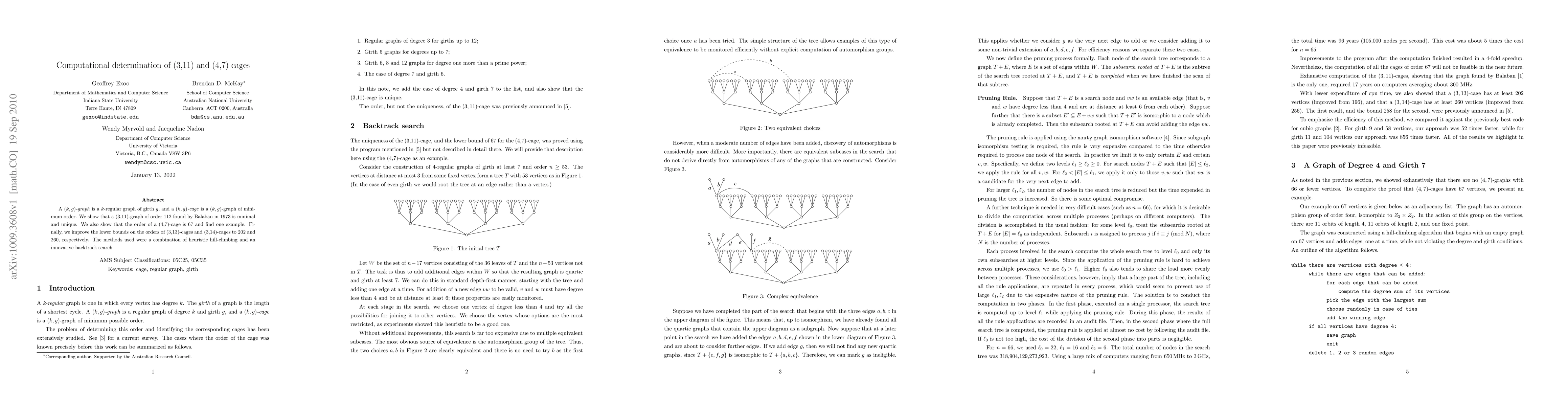 A (k,g)-graph is a k-regular graph of girth g, and a (k,g)-cage is a (k,g)-graph of minimum order. We show that a (3,11)-graph of order 112 found by Balaban in 1973 is minimal and unique. We also show that the order of a (4,7)-cage is 67 and find one example. Finally, we improve the lower bounds on the orders of (3,13)-cages and (3,14)-cages to 202 and 260, respectively. The methods used were a combination of heuristic hill-climbing and an innovative backtrack search.
