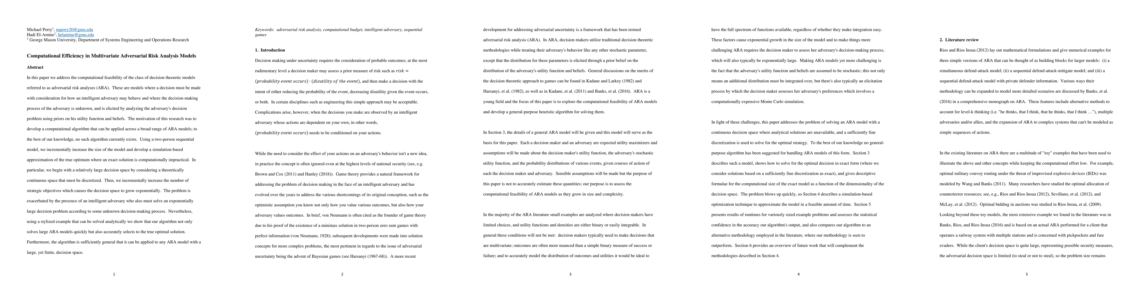 This paper develops a computational algorithm to efficiently analyze adversarial risk models with large decision spaces, accurately selecting optimal solutions and addressing the challenge of intelligent adversaries.