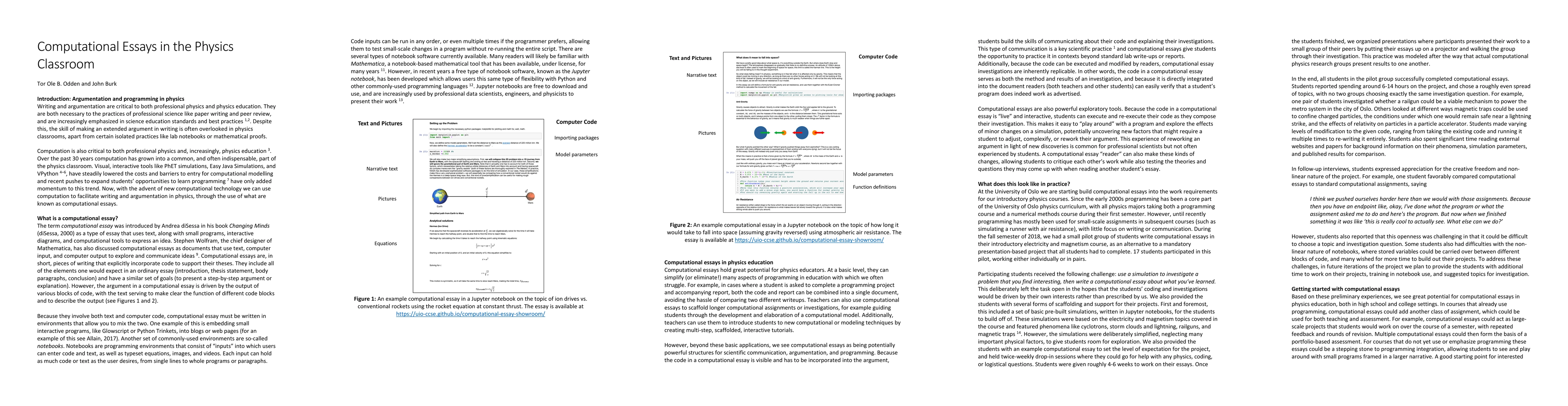 This paper explores the use of computational essays in physics education to enhance students' argumentative writing skills and computational thinking. The authors describe the integration of text and code in these assignments and present preliminary results from their pilot implementation in an undergraduate physics course.